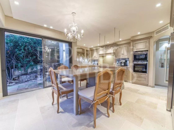 La villa comprend un spacieux séjour avec espace repas s’ouvrant sur une jolie terrasse, une cuisine entièrement équipée, 5 chambres à coucher, 5 salles de bains ou douche, un bureau, un wc invités, sauna et hammam, espace repos extérieur, piscine, garage pour 3 voitures, aire de jeux pour les enfants.