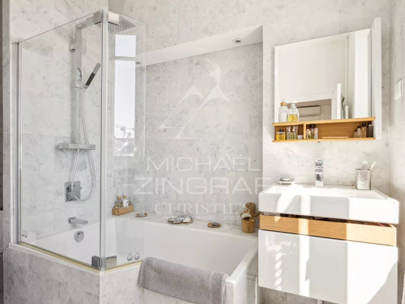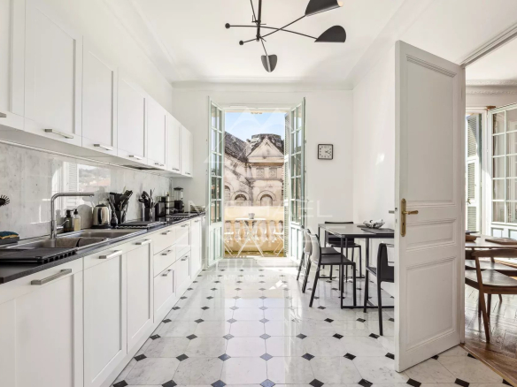 Il comprend, une vaste entrée en marbre de Carrare, une double réception avec ses créations de moulures au plafond et parquets en chêne à bâtons rompus d’origine avec accès sur un beau balcon exposé à l’ouest, une grande cuisine séparée en marbre de Carrare entièrement meublée et équipée avec également un accès sur le balcon, 3 grandes chambres avec chacune sa salle de bains/eau dont deux en suite avec leurs dressings et leurs wc individuels, un wc invité. De nombreux rangements.
