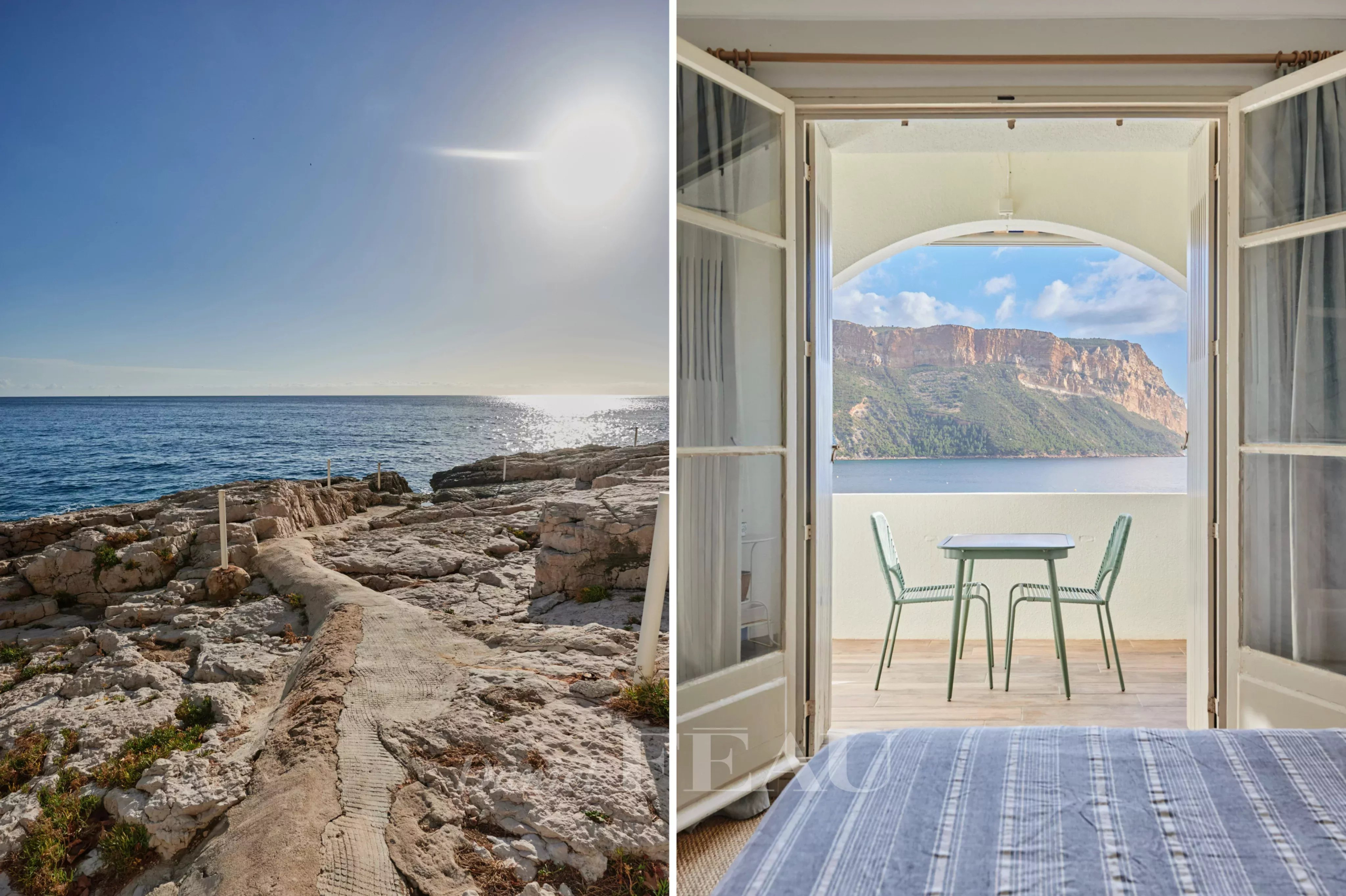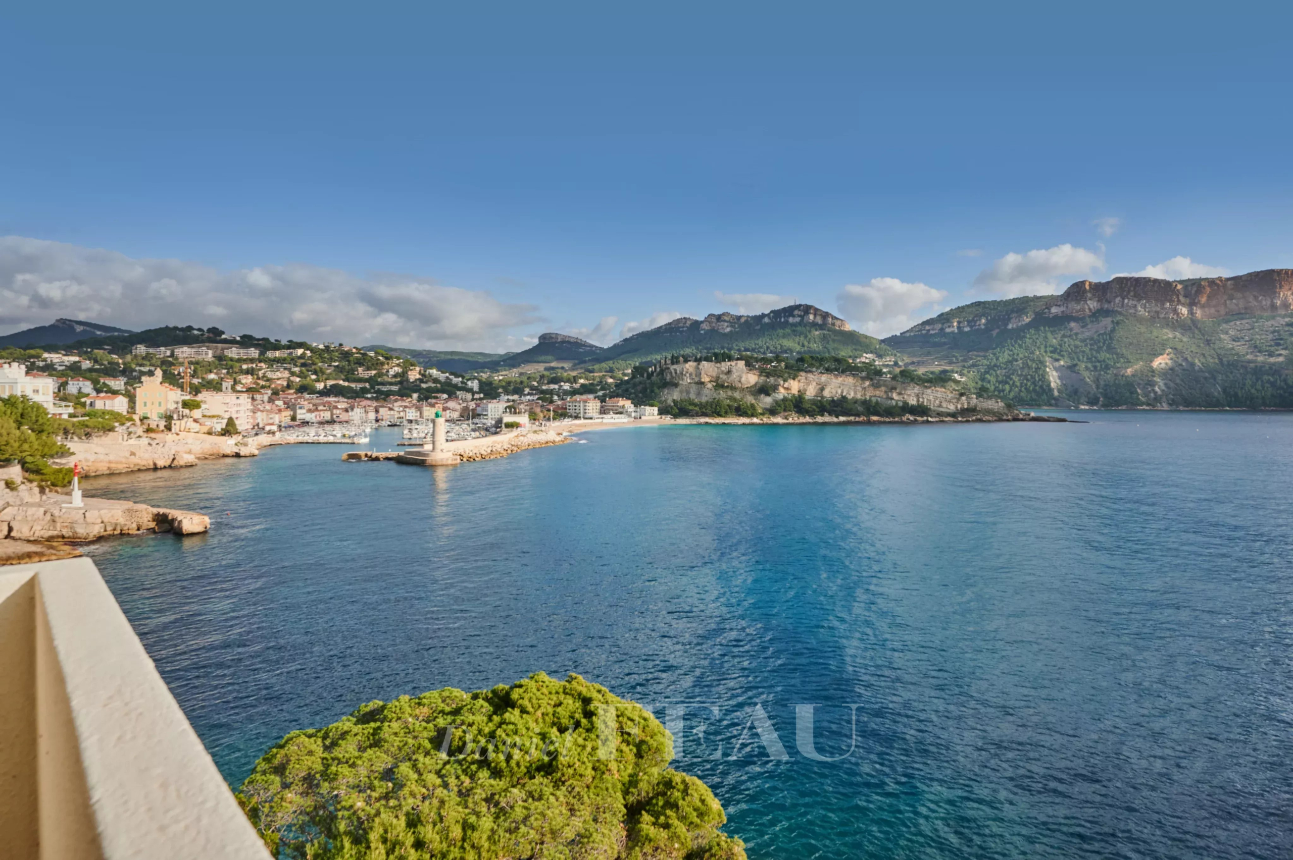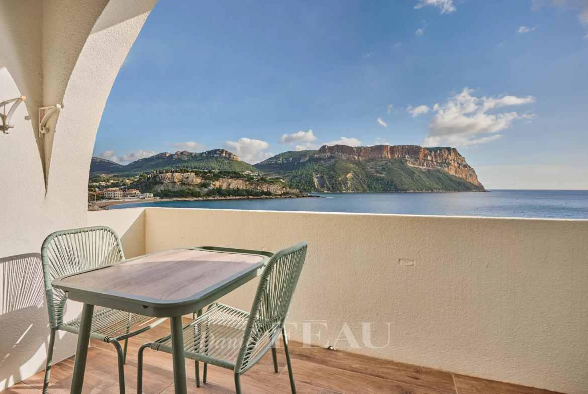 Au troisième et dernier étage d’un immeuble emblématique de Cassis profitant d’un accès mer, appartement offrant une vue panoramique sur la mer, le Cap Canaille et le port.