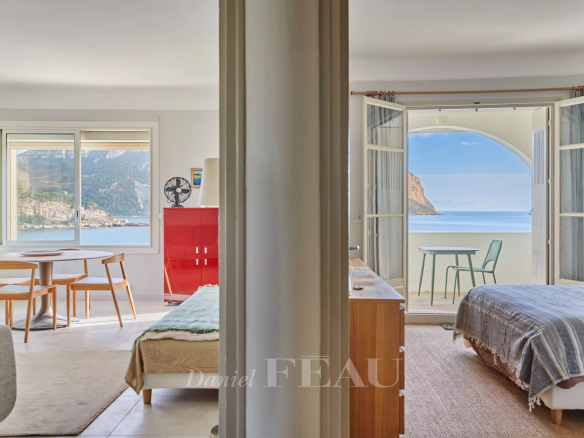 La terrasse de 6m², surplombant la Méditerranée, est accessible par le séjour et l’une des deux chambres.