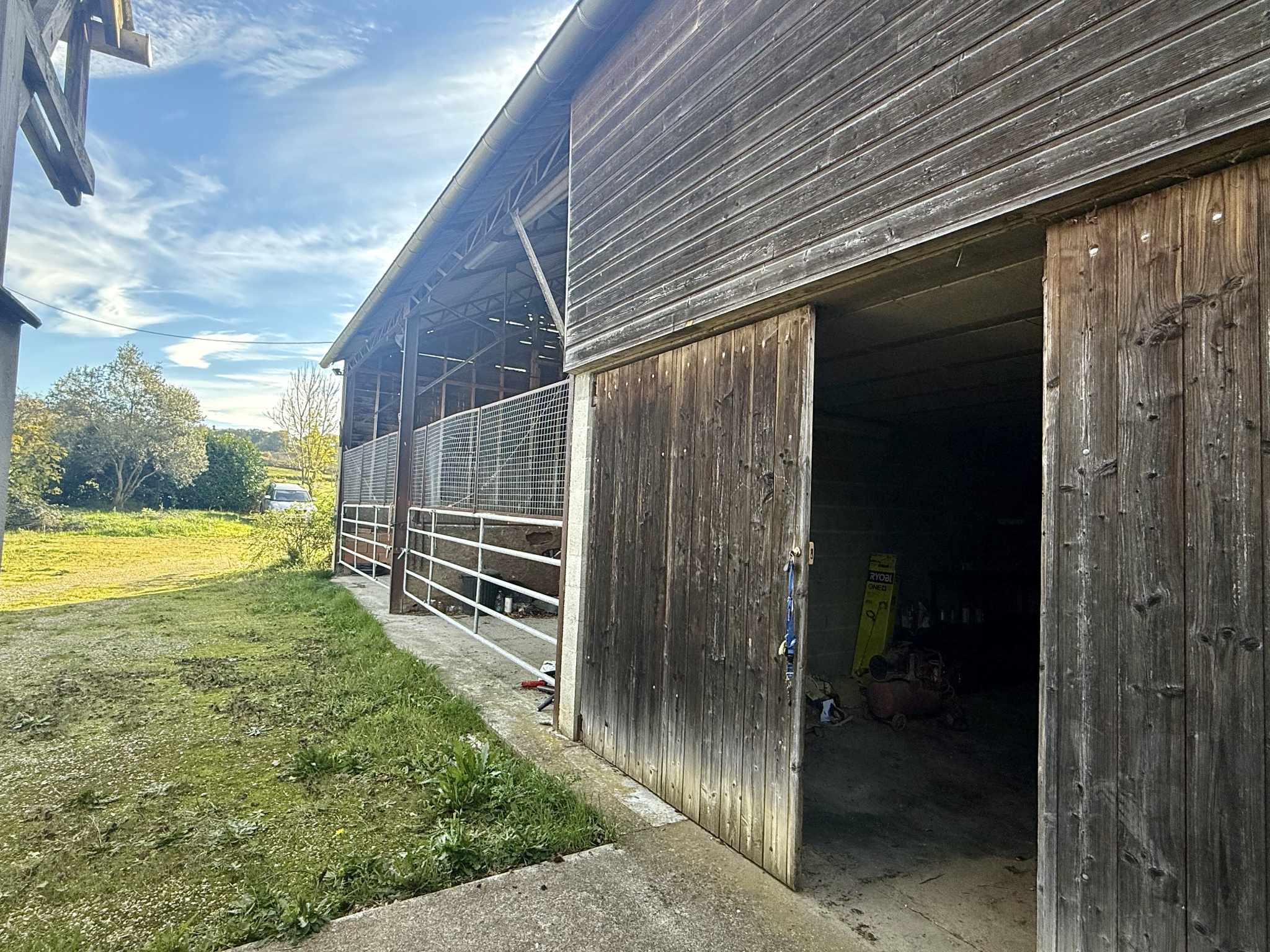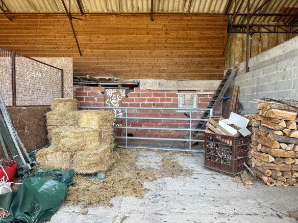 La grange attenante comprend un petit logement pour le palefrenier, tandis que le reste de l’espace est idéal pour le stockage du foin et des véhicules agricoles, avec un sellerie sécurisée à une extrémité.