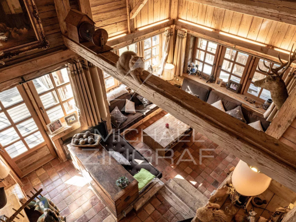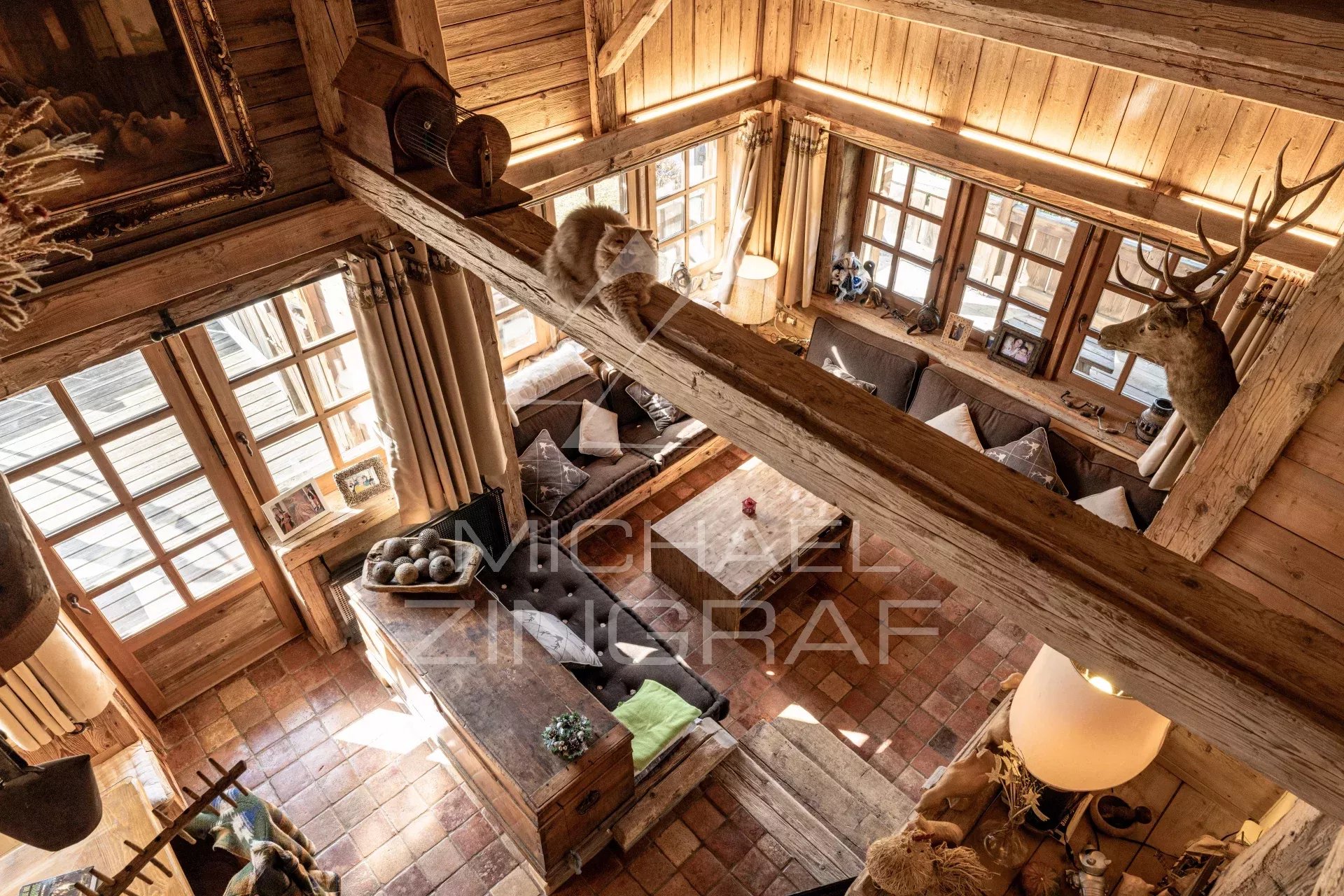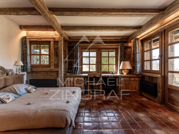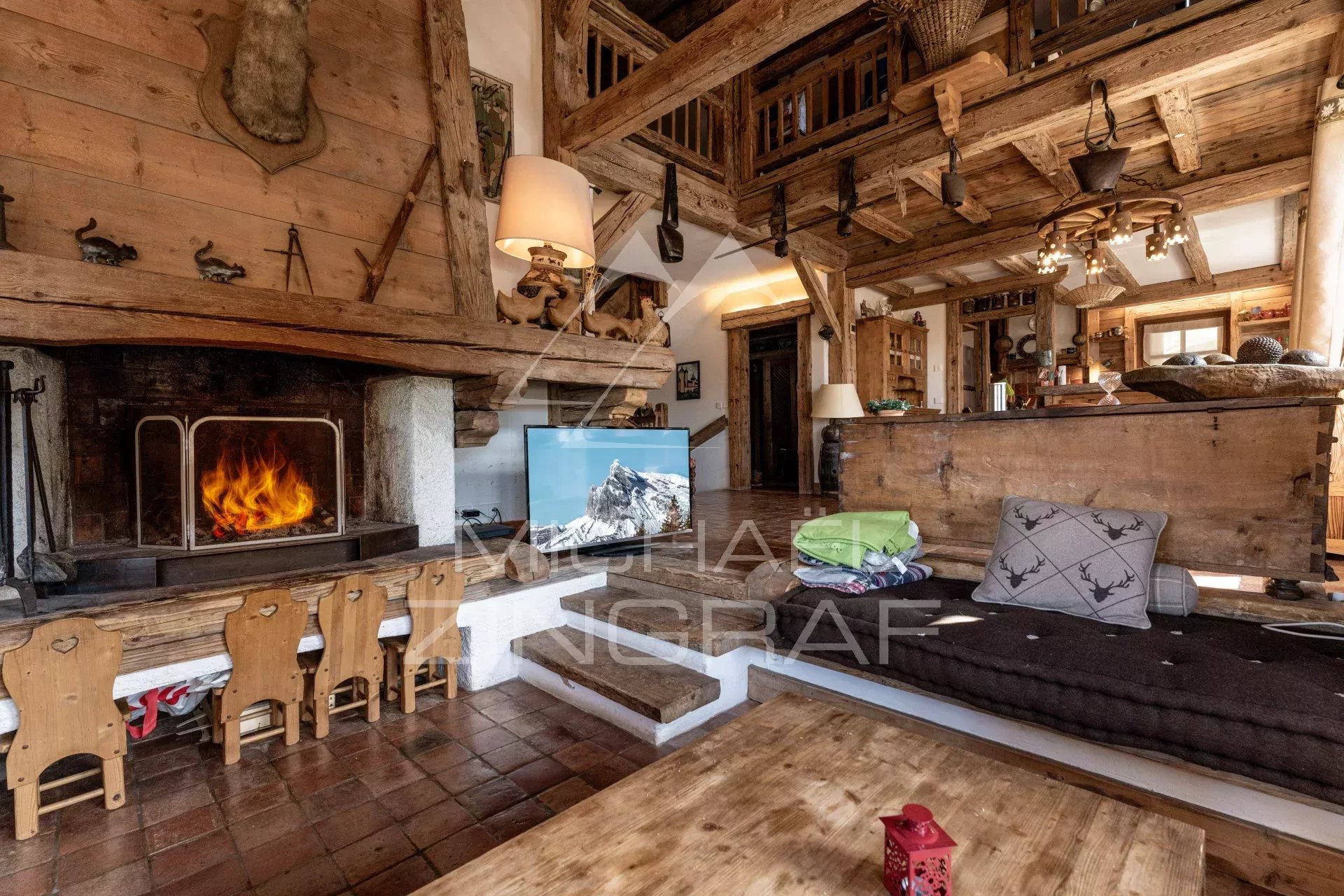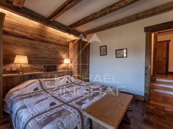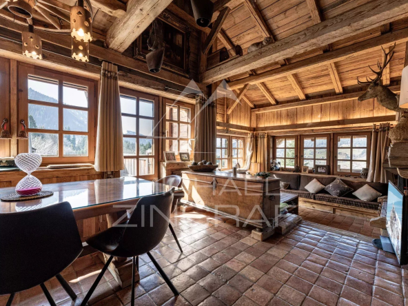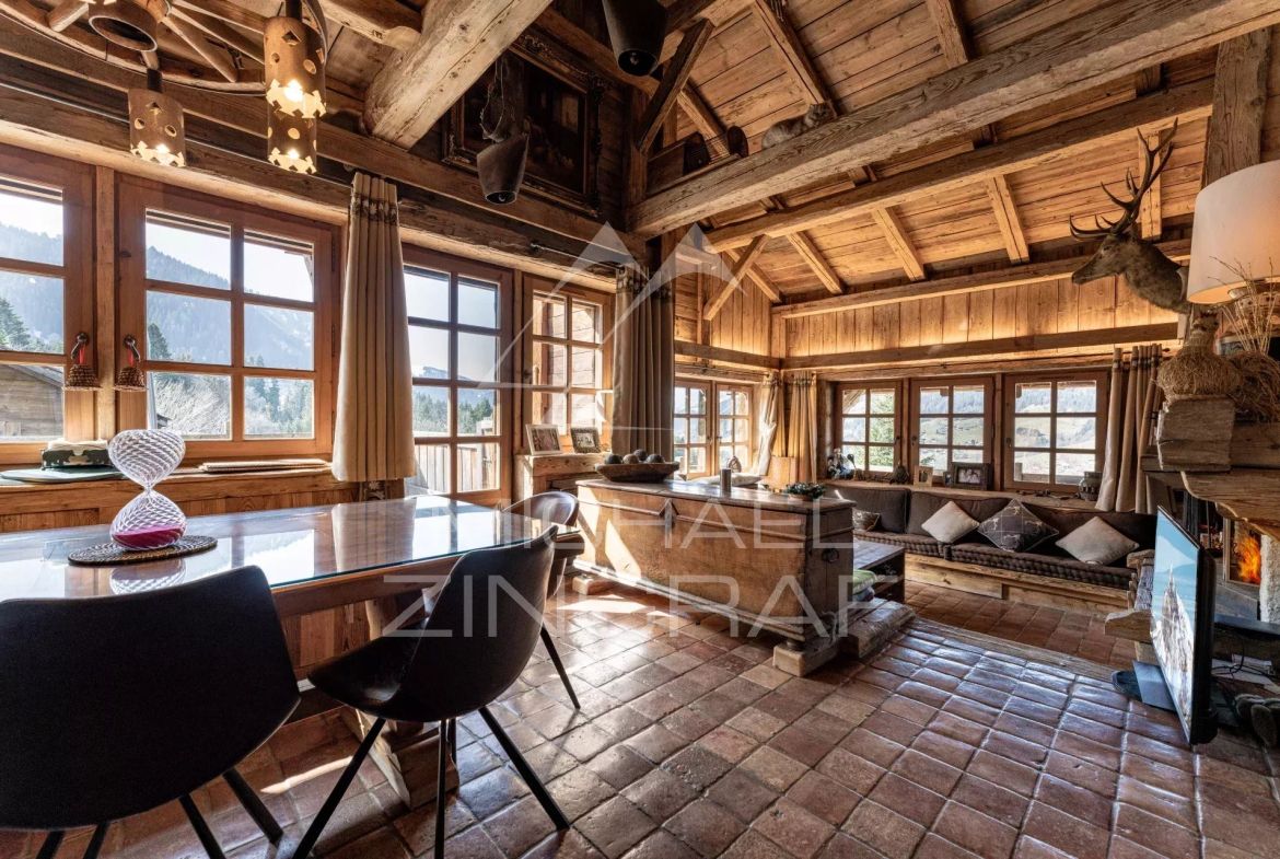 Cet authentique chalet en vieux bois offre six chambres (dont cinq en-suite et un dortoir enfants), un double salon-salle à manger avec plafond cathédrale et cheminée ouverte, et une cuisine équipée ouverte s’ouvrant sur une vaste terrasse Sud-Ouest.