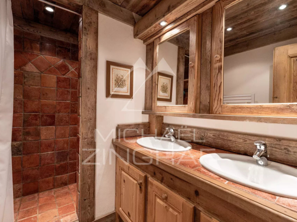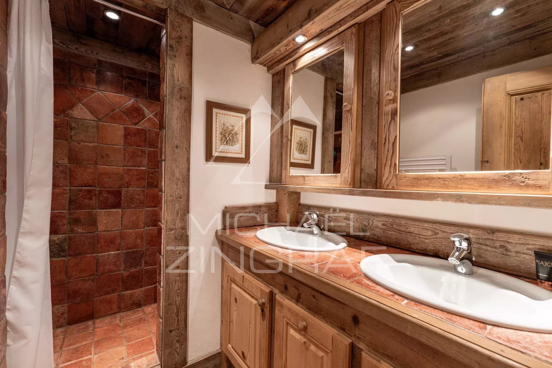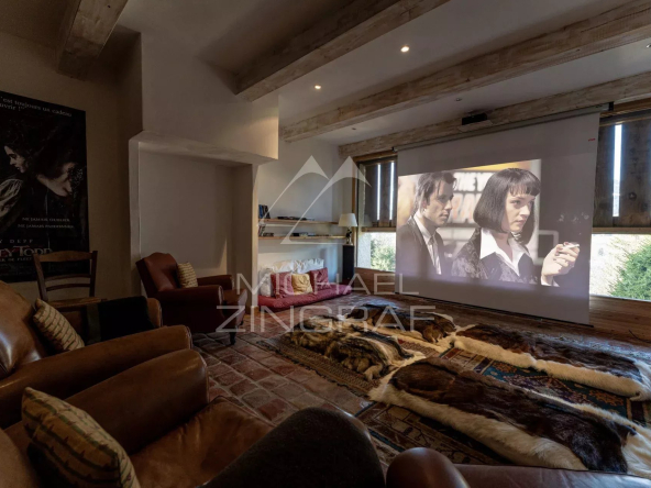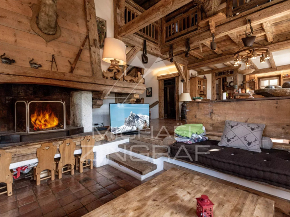 Cet authentique chalet en vieux bois offre six chambres (dont cinq en-suite et un dortoir enfants), un double salon-salle à manger avec plafond cathédrale et cheminée ouverte, et une cuisine équipée ouverte s’ouvrant sur une vaste terrasse Sud-Ouest.