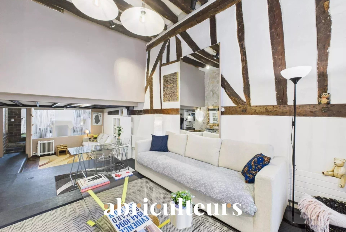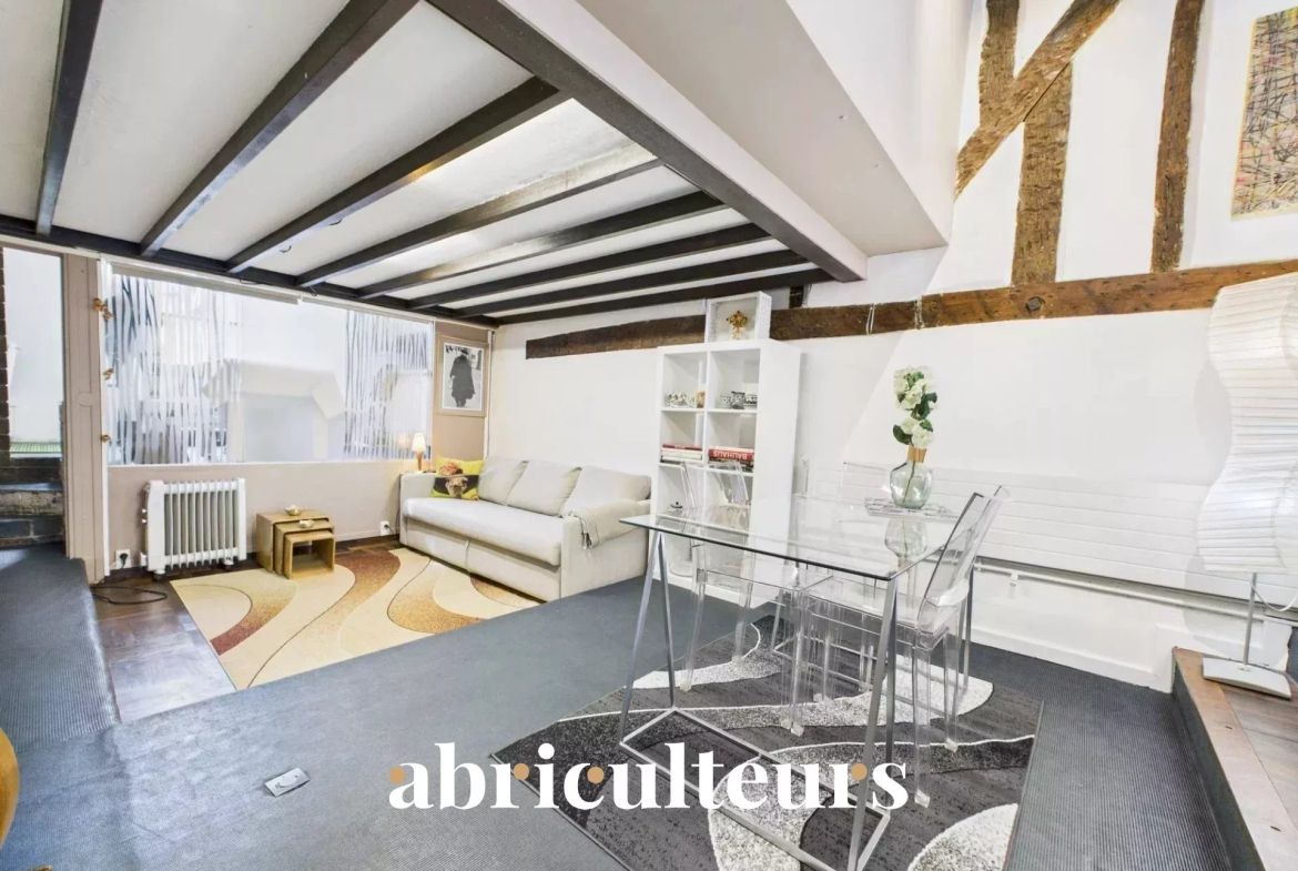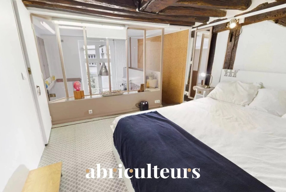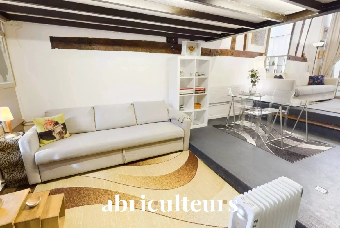 L’appartement se compose d’un agréable séjour donnant sur rue, au charme indéniable avec ses poutres en bois, ses pierres apparentes et sa belle hauteur sous plafond. Une kitchenette ouverte donnant sur une cour arborée, offre un coin de verdure en pleine ville. À l’étage, une mezzanine abrite un espace nuit confortable, accompagné d’une salle de douche et de toilettes séparées.