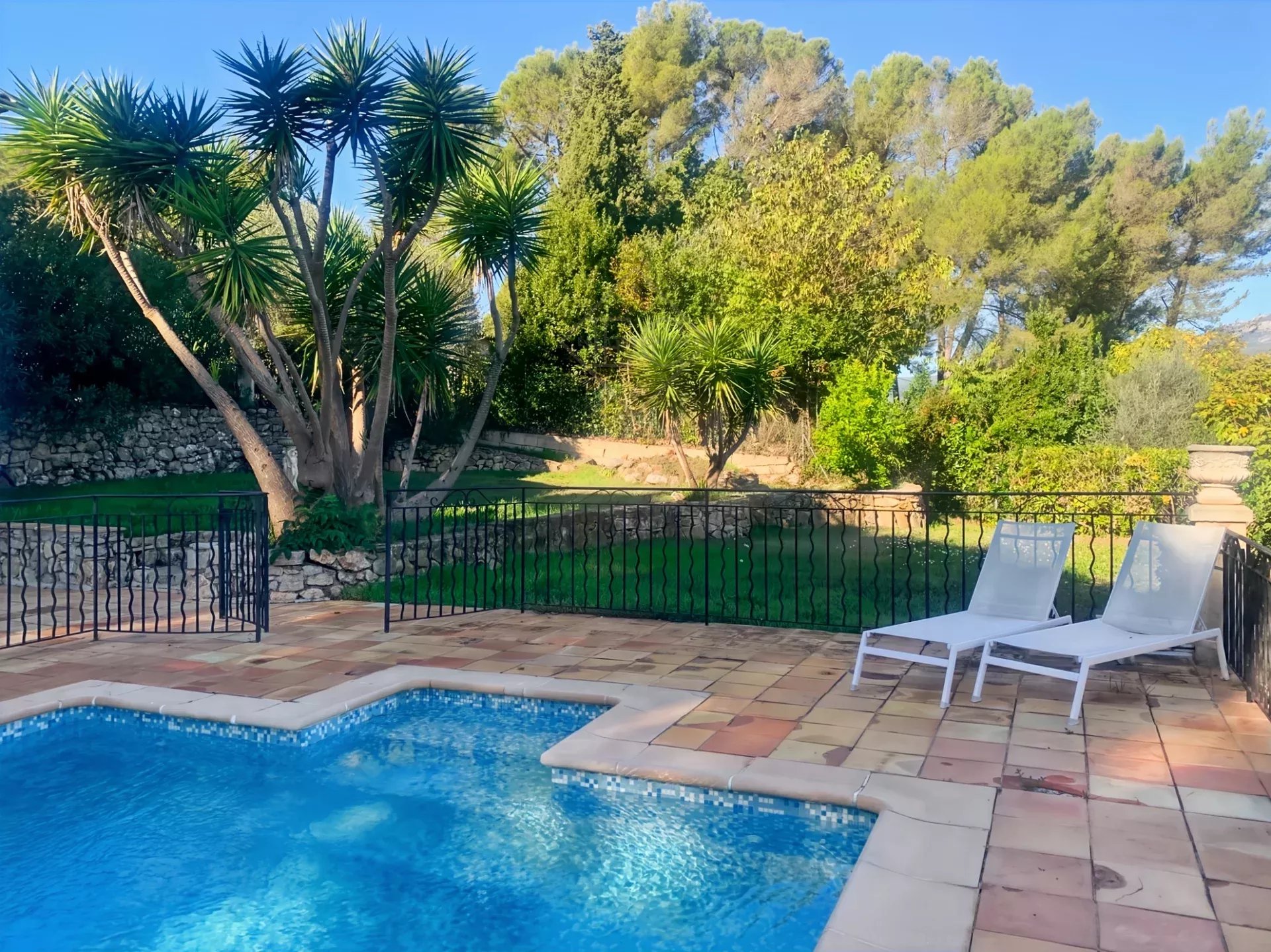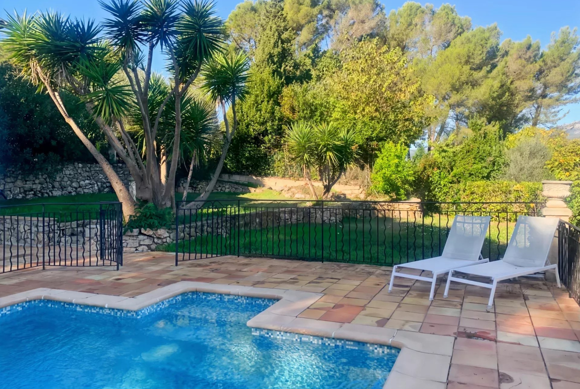 Une cuisine d’été s’ouvre sur la terrasse bordant la piscine traditionnelle en dur, orientée plein sud et offrant une superbe vue sur la vallée.