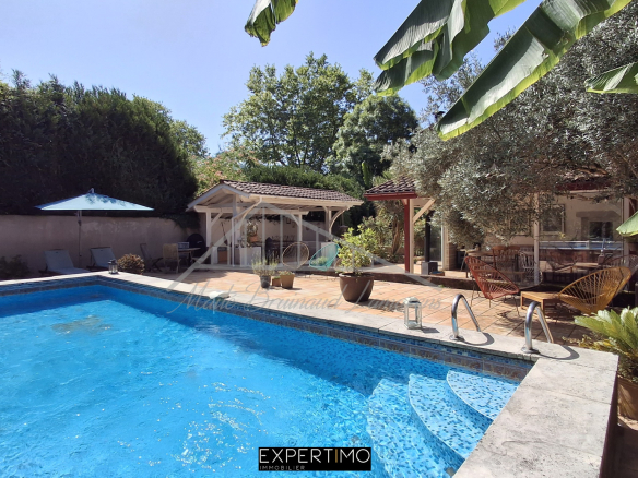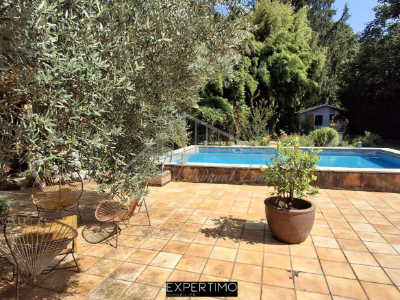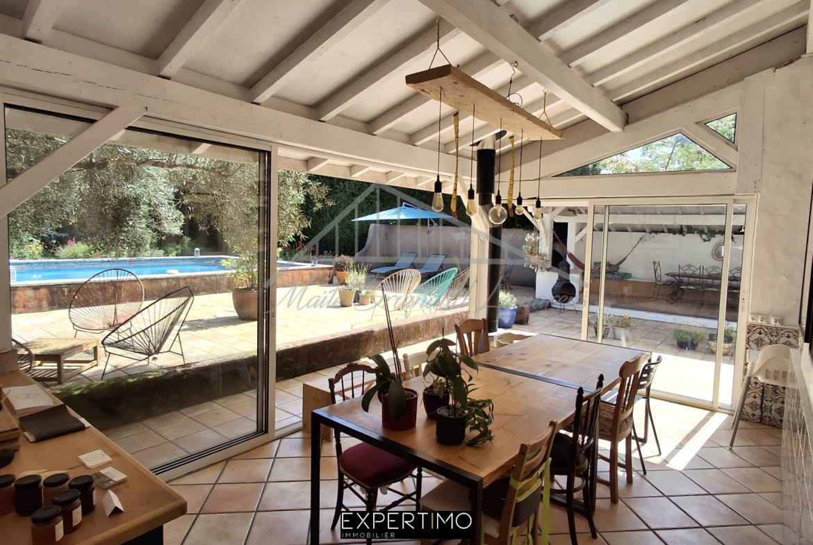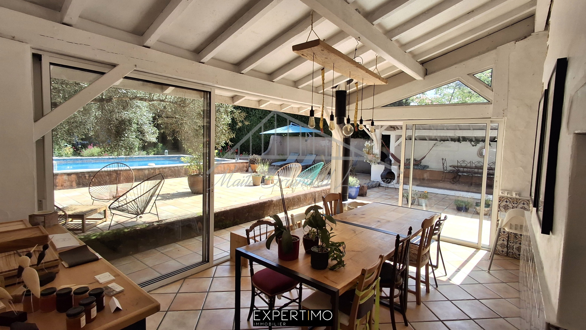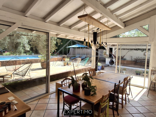 Un beau jardin, fleuri et arboré, comme un écrin de verdure protège des regards les abords des terrasses et de la piscine. Une véranda, tout en lumière plonge dans le jardin, la terrasse couverte et la piscine ; vous y serez confortablement installés en toutes saisons grâce à son poêle à bois. Pour le côté pratique, celle-ci jouxte la cuisine, parfaitement équipée et aux dimensions généreuses.