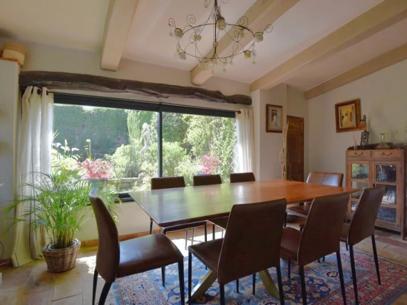 Une élégante salle à manger, une cuisine équipée, ainsi qu’un chaleureux salon avec cheminée.