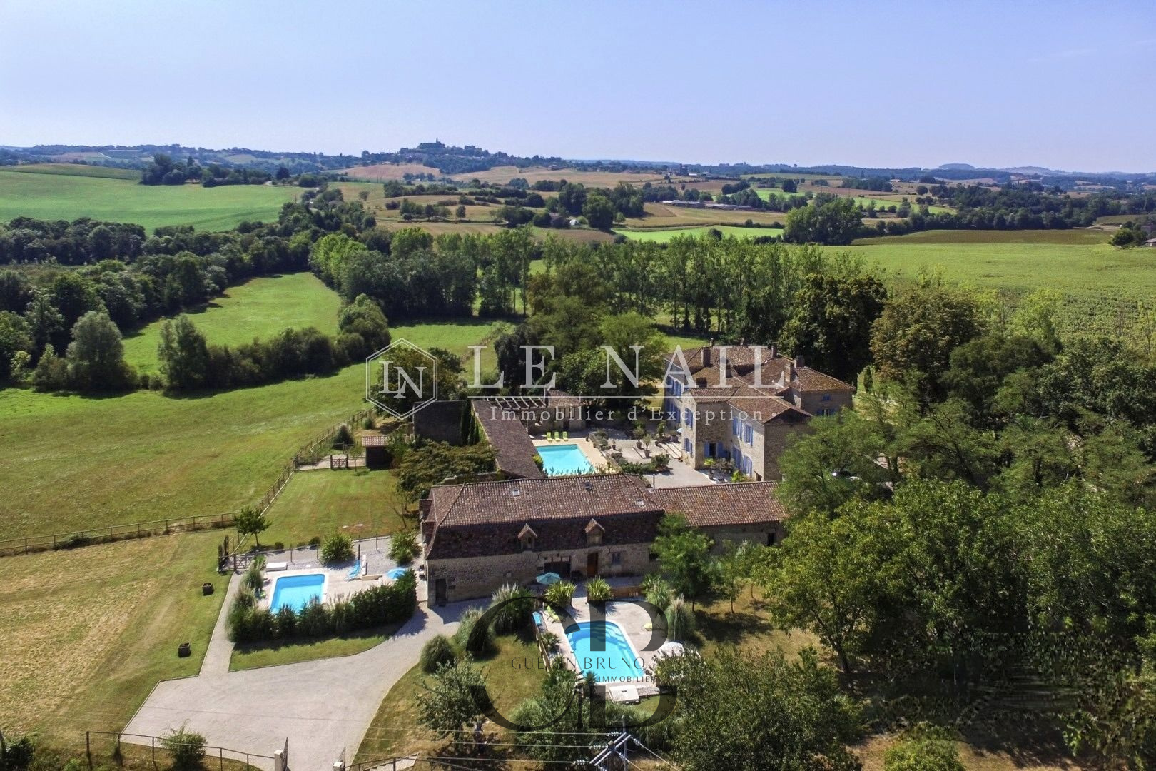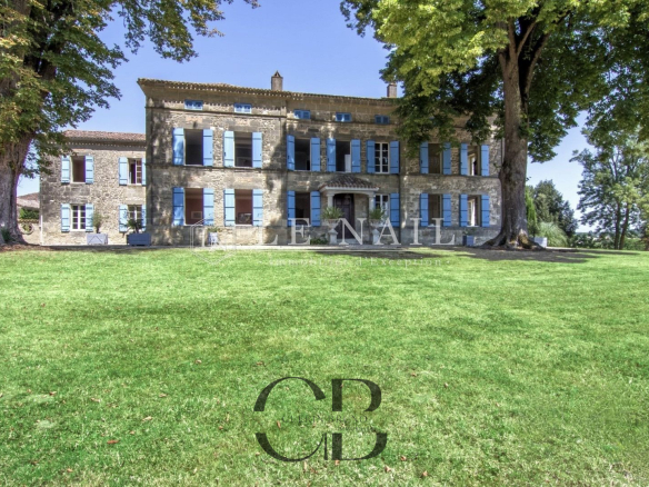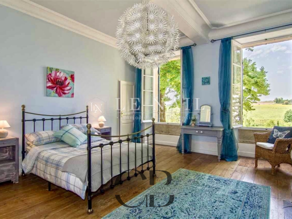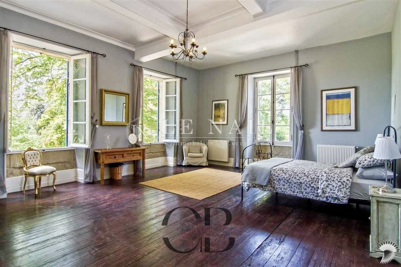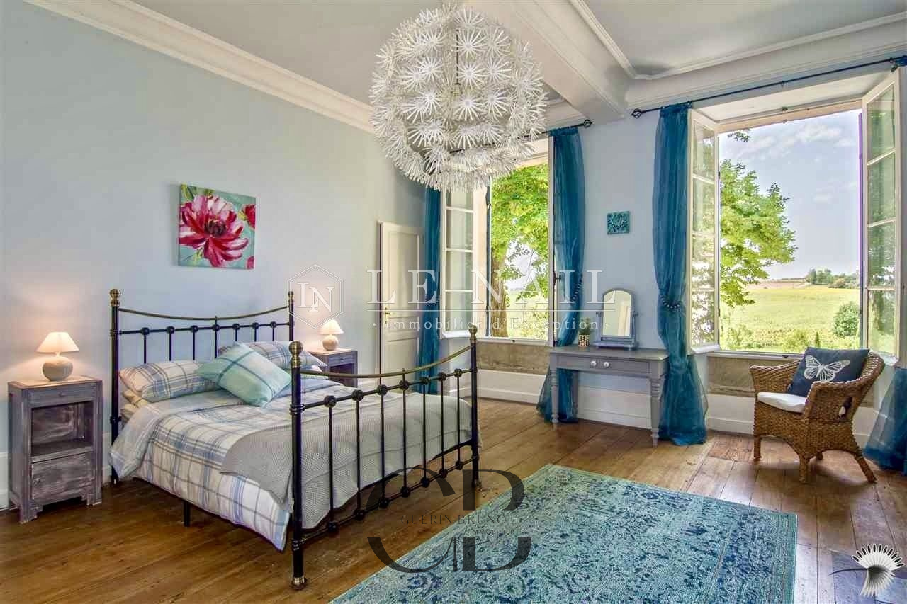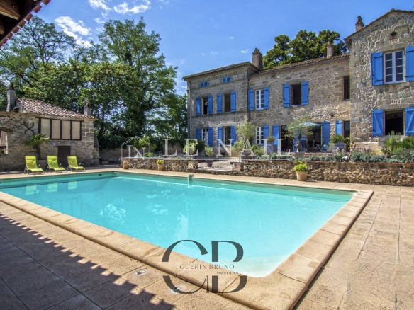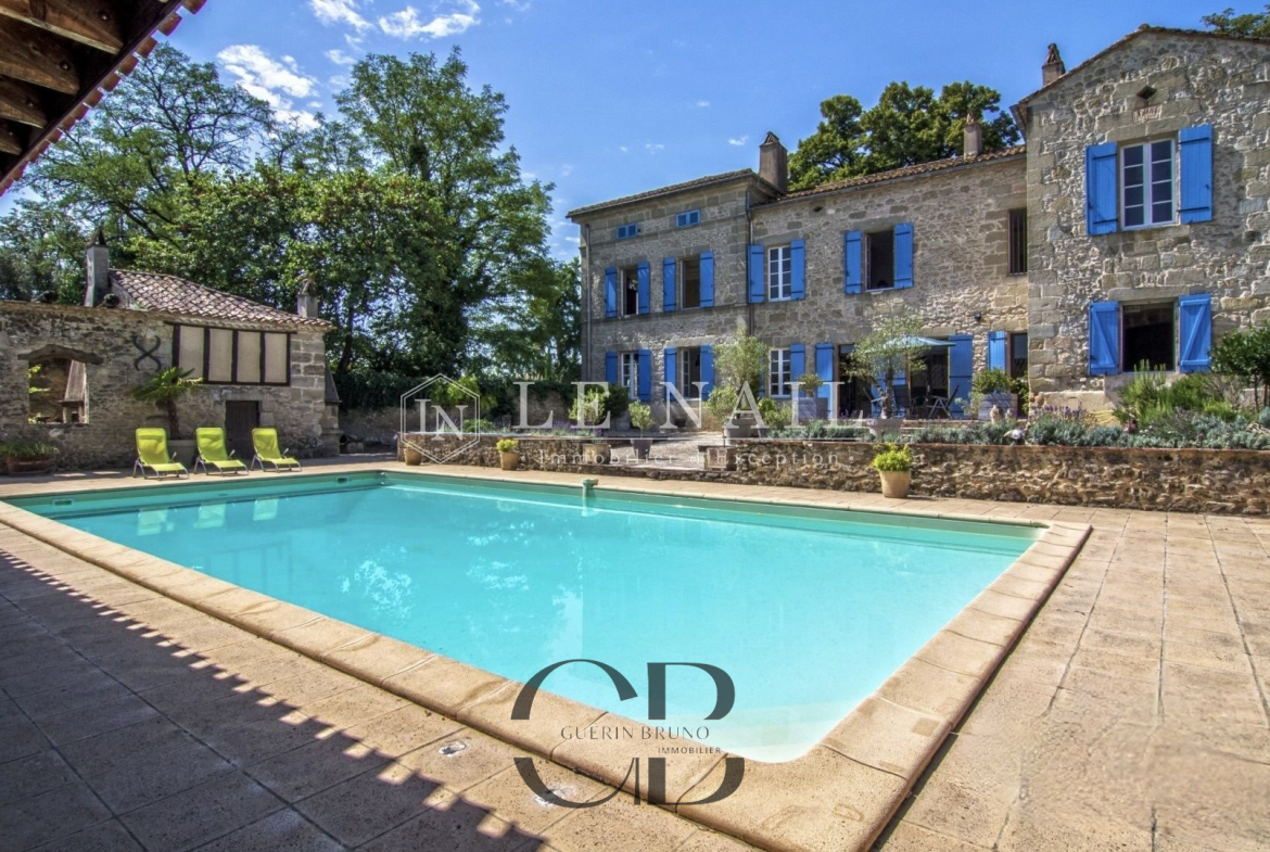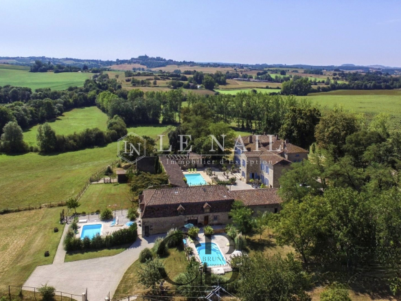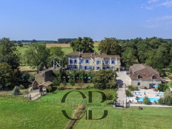 Belle demeure de campagne dans le Lot-et-Garonne. Située dans la campagne vallonnée du Lot-et-Garonne, dont vous apprécierez le calme et le bon vivre de la région, cette magnifique propriété du XVIIIème siècle, perchée sur les hauteurs, est à 9 km d’un village assurant les premiers services et à 30 minutes de Bergerac, la ville ressource. La ville de Bordeaux est située à 125 km, Paris à seulement 3h15 depuis la ville de Bergerac (TGV), et Londres en 2 heures avec des rotations quotidiennes depuis Bergerac. On accède au château en franchissant une grille et une allée bordée de chênes. Un beau pigeonnier se dresse dans la cour d’entrée de la propriété. Cette élégante et imposante propriété du XVIIIème siècle est composée d’un corps principal et de diverses dépendances qui forment une cour rectangulaire où la vie s’organise autour d’une piscine et de plusieurs terrasses. Entièrement bâties en pierres locales qui ont grisé avec le temps, la façade et les nombreuses ouvertures, aux couleurs méditerranéennes, proposent un contraste intéressant. L’édifice est recouvert de tuiles de types canal, les chainages, les soubassements sont soulignés par un travail de taille. Le château, d’une surface habitable d’environ 640m2, comprend: Au rez-de-chaussée: une vaste entrée (37m2) s’ouvre sur deux pièces, à droite un salon (32m2) avec cheminée et bibliothèque attenante, à gauche une salle de billard (37m2) et wc attenant. Un dégagement d’une belle superficie permet l’accès à l’étage et à la seconde partie du rez-de-chaussée, un bureau (34m2) communicant avec la bibliothèque, un salon/salle à manger avec en son prolongement un espace cuisine totalement aménagé (93m2). Attenant à l’espace cuisine une arrière cuisine avec le second escalier pour l’étage, puis un escalier pour accéder à la cave. A l’étage: 7 chambres dont 5 avec salles de bains/douches, toutes profitent d’une vue dégagée sur la campagne. Au deuxième étage: un grenier (100m2). Au sous-sol: une cave Cet ensemble immobilier est destiné à la location durant l’été, les propriétaires ayant rénové une ancienne grange en 2014 afin d’y créer 3 logements et un espace commun. Les deux premiers logements sont des gîtes comprenant, au rez-de-chaussée : un grand séjour/cuisine et à l’étage : 2 chambres avec une salle d’eau et wc. A l’extérieur :une grande terrasse avec piscine privative, l’ensemble est aux standards du confort moderne. Le logement de gardien comprend au rez-de-chaussée un grand séjour/cuisine et à l’étage 2 chambres avec une salle d’eau et wc. A l’extérieur, une grande terrasse, l’ensemble est aux standards modernes. L’espace commun comprend une grande lingerie et un espace fitness. Situé dans le parc du château à l’abri des regards, un pigeonnier entièrement rénové comprenant: au rez-de-chaussée, un espace de vie (cuisine/séjour) ouvert sur la terrasse en bois et à l’étage une chambre et une salle de bains. Un garage, écurie pour les chevaux, une grande terrasse couverte et un espace barbecue. Le château est implanté au milieu d’un agréable parc de plus de 7,21 ha. Différentes essences d’arbres y sont implantées, certaines centenaires, à souligner qu’un point d’eau est présent sur la propriété .