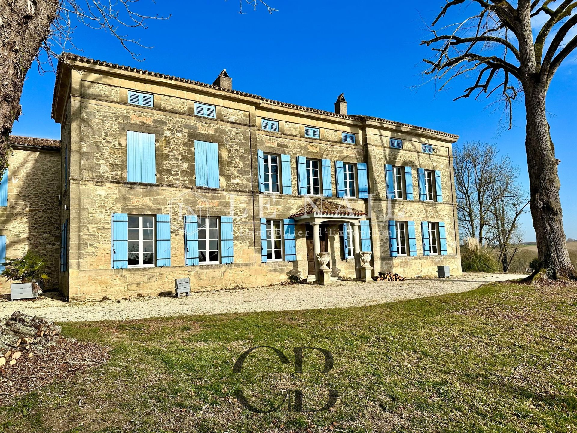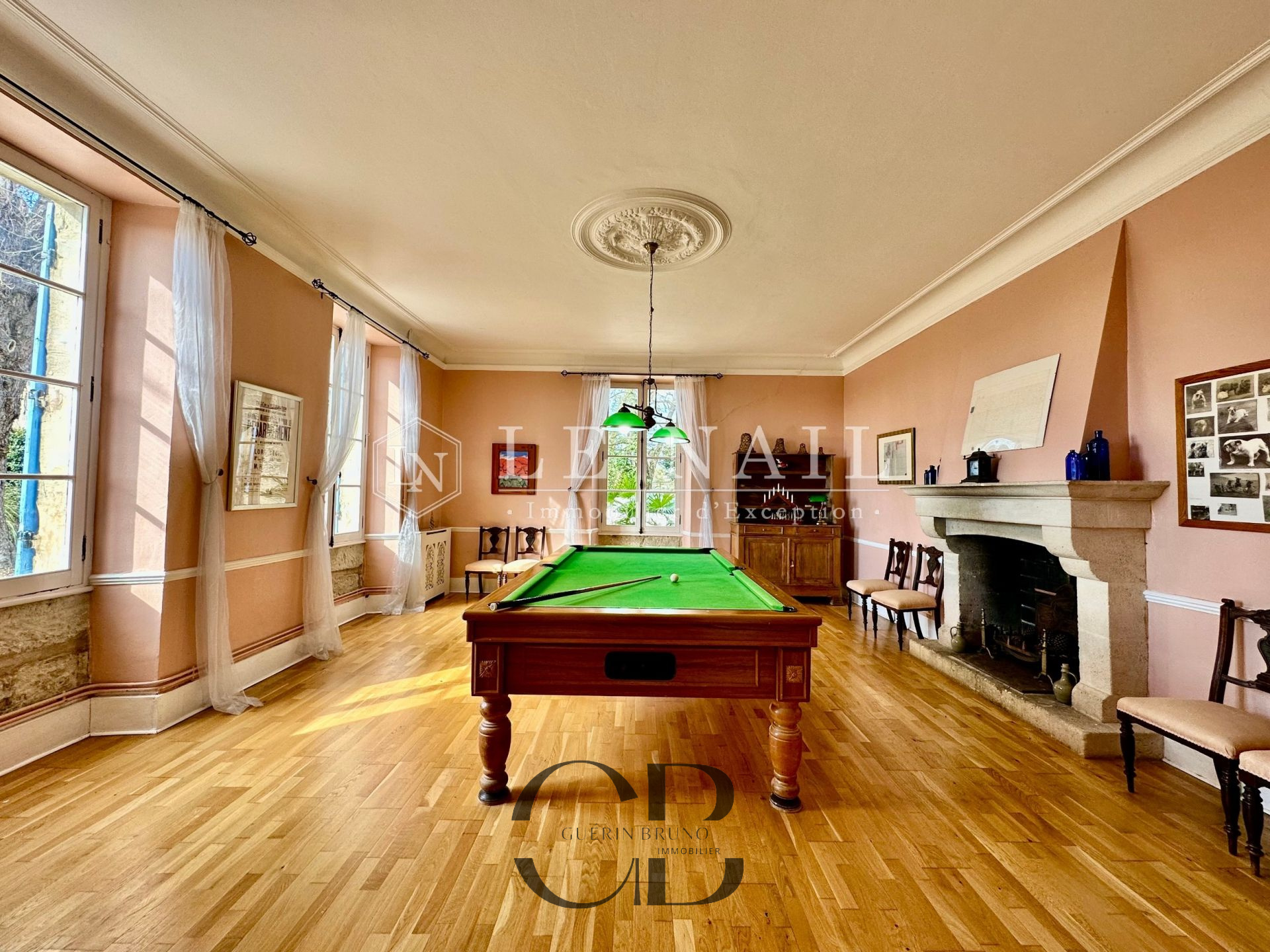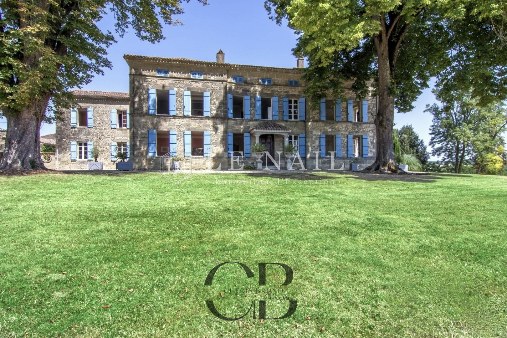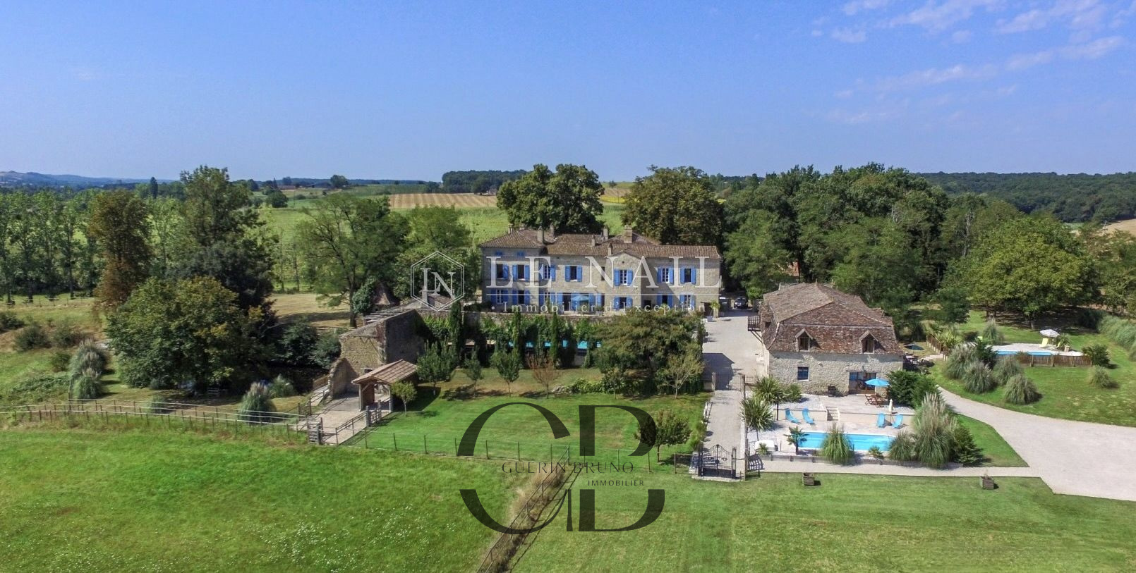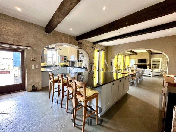 Belle demeure de campagne dans le Lot-et-Garonne. Située dans la campagne vallonnée du Lot-et-Garonne, dont vous apprécierez le calme et le bon vivre de la région, cette magnifique propriété du XVIIIème siècle, perchée sur les hauteurs, est à 9 km d’un village assurant les premiers services et à 30 minutes de Bergerac, la ville ressource. La ville de Bordeaux est située à 125 km, Paris à seulement 3h15 depuis la ville de Bergerac (TGV), et Londres en 2 heures avec des rotations quotidiennes depuis Bergerac. On accède au château en franchissant une grille et une allée bordée de chênes. Un beau pigeonnier se dresse dans la cour d’entrée de la propriété. Cette élégante et imposante propriété du XVIIIème siècle est composée d’un corps principal et de diverses dépendances qui forment une cour rectangulaire où la vie s’organise autour d’une piscine et de plusieurs terrasses. Entièrement bâties en pierres locales qui ont grisé avec le temps, la façade et les nombreuses ouvertures, aux couleurs méditerranéennes, proposent un contraste intéressant. L’édifice est recouvert de tuiles de types canal, les chainages, les soubassements sont soulignés par un travail de taille. Le château, d’une surface habitable d’environ 640m2, comprend: Au rez-de-chaussée: une vaste entrée (37m2) s’ouvre sur deux pièces, à droite un salon (32m2) avec cheminée et bibliothèque attenante, à gauche une salle de billard (37m2) et wc attenant. Un dégagement d’une belle superficie permet l’accès à l’étage et à la seconde partie du rez-de-chaussée, un bureau (34m2) communicant avec la bibliothèque, un salon/salle à manger avec en son prolongement un espace cuisine totalement aménagé (93m2). Attenant à l’espace cuisine une arrière cuisine avec le second escalier pour l’étage, puis un escalier pour accéder à la cave. A l’étage: 7 chambres dont 5 avec salles de bains/douches, toutes profitent d’une vue dégagée sur la campagne. Au deuxième étage: un grenier (100m2). Au sous-sol: une cave Cet ensemble immobilier est destiné à la location durant l’été, les propriétaires ayant rénové une ancienne grange en 2014 afin d’y créer 3 logements et un espace commun. Les deux premiers logements sont des gîtes comprenant, au rez-de-chaussée : un grand séjour/cuisine et à l’étage : 2 chambres avec une salle d’eau et wc. A l’extérieur :une grande terrasse avec piscine privative, l’ensemble est aux standards du confort moderne. Le logement de gardien comprend au rez-de-chaussée un grand séjour/cuisine et à l’étage 2 chambres avec une salle d’eau et wc. A l’extérieur, une grande terrasse, l’ensemble est aux standards modernes. L’espace commun comprend une grande lingerie et un espace fitness. Situé dans le parc du château à l’abri des regards, un pigeonnier entièrement rénové comprenant: au rez-de-chaussée, un espace de vie (cuisine/séjour) ouvert sur la terrasse en bois et à l’étage une chambre et une salle de bains. Un garage, écurie pour les chevaux, une grande terrasse couverte et un espace barbecue. Le château est implanté au milieu d’un agréable parc de plus de 7,21 ha. Différentes essences d’arbres y sont implantées, certaines centenaires, à souligner qu’un point d’eau est présent sur la propriété .