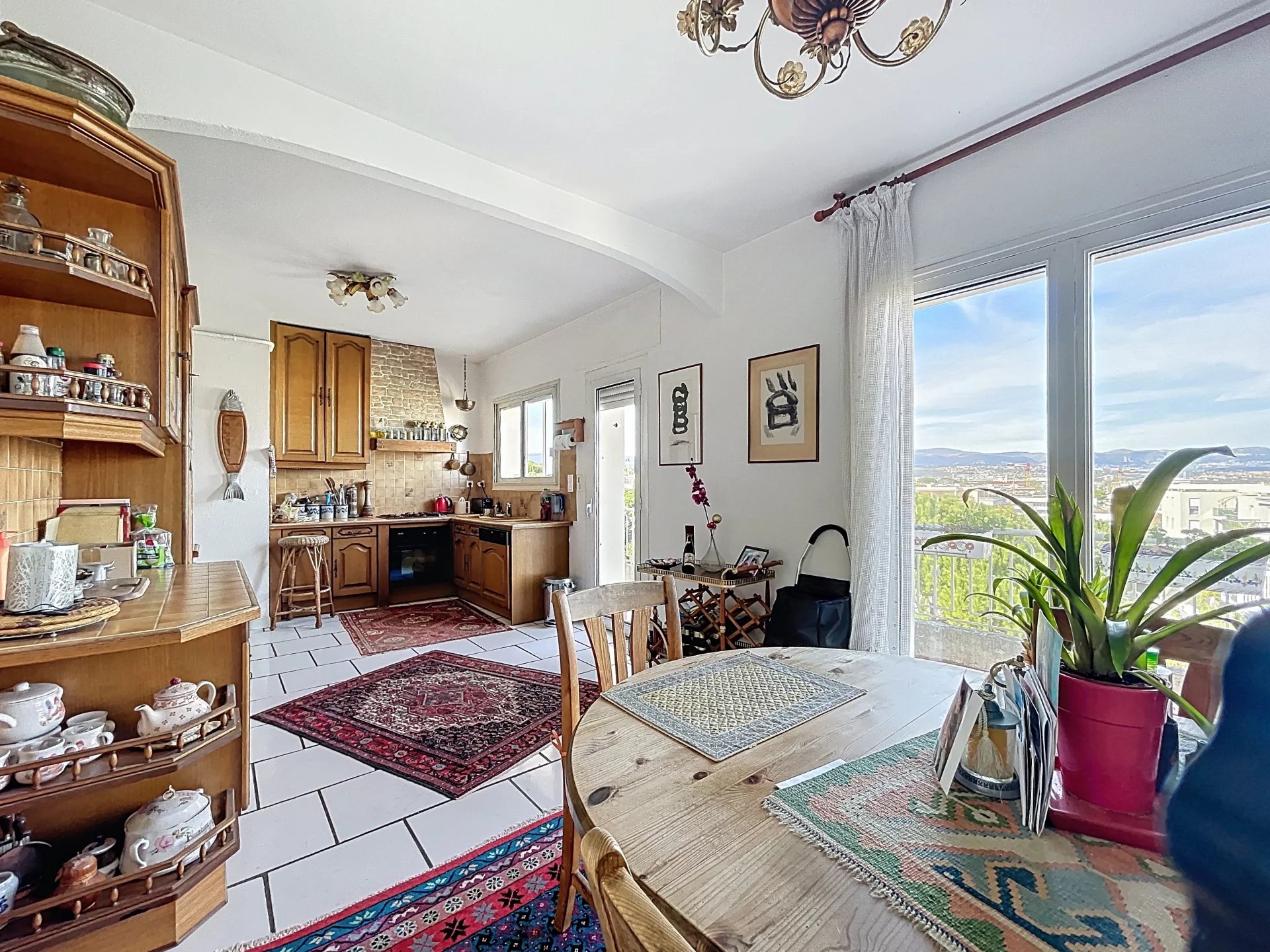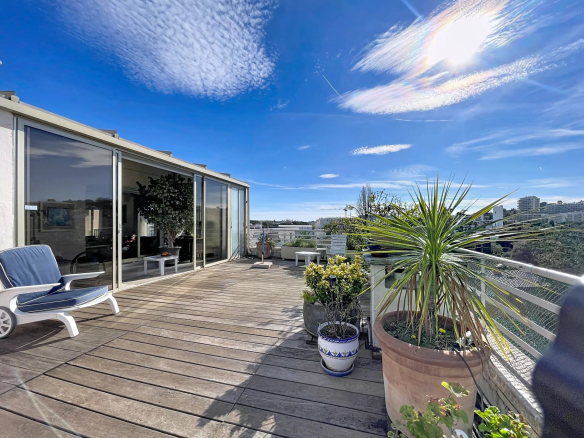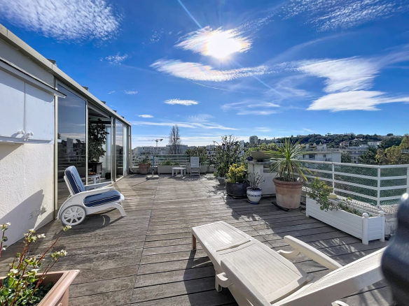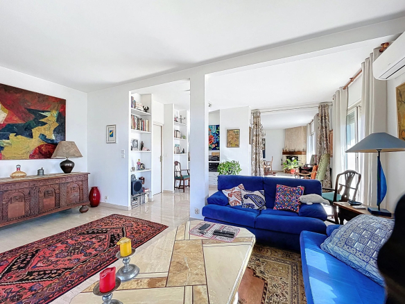 Cet appartement bénéficie d’une triple exposition ce qui le rend très lumineux. Il se compose d’une entrée, d’une salle à manger avec cheminée donnant sur une terrasse exposée Sud, d’un salon avec véranda qui ouvre sur la grande terrasse orientée ouest, d’une spacieuse cuisine avec balcon orienté nord, d’une chambre avec salle d’eau et WC, d’une 2ème chambre avec salle de bains, 2 WC indépendants. Nombreux rangements.