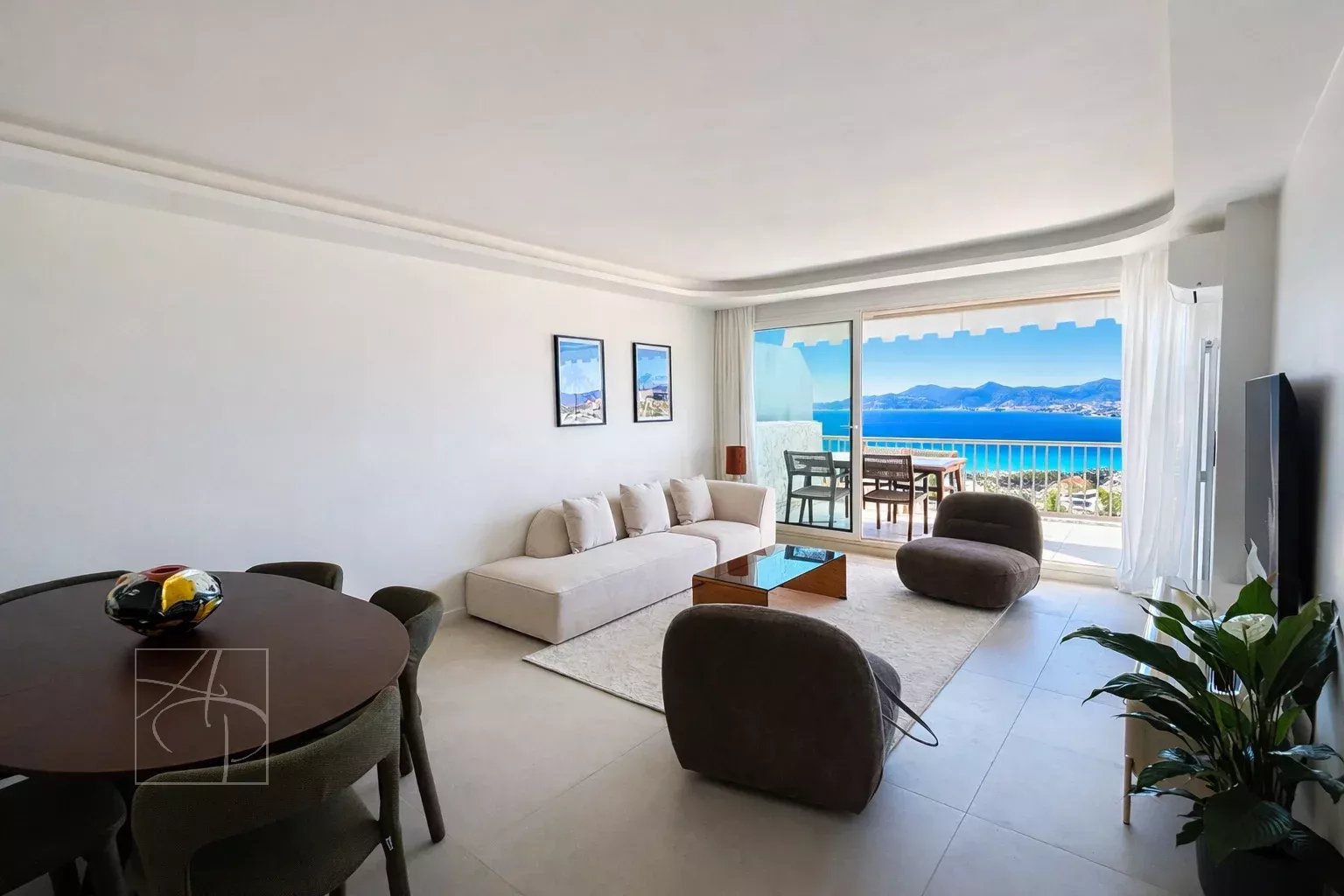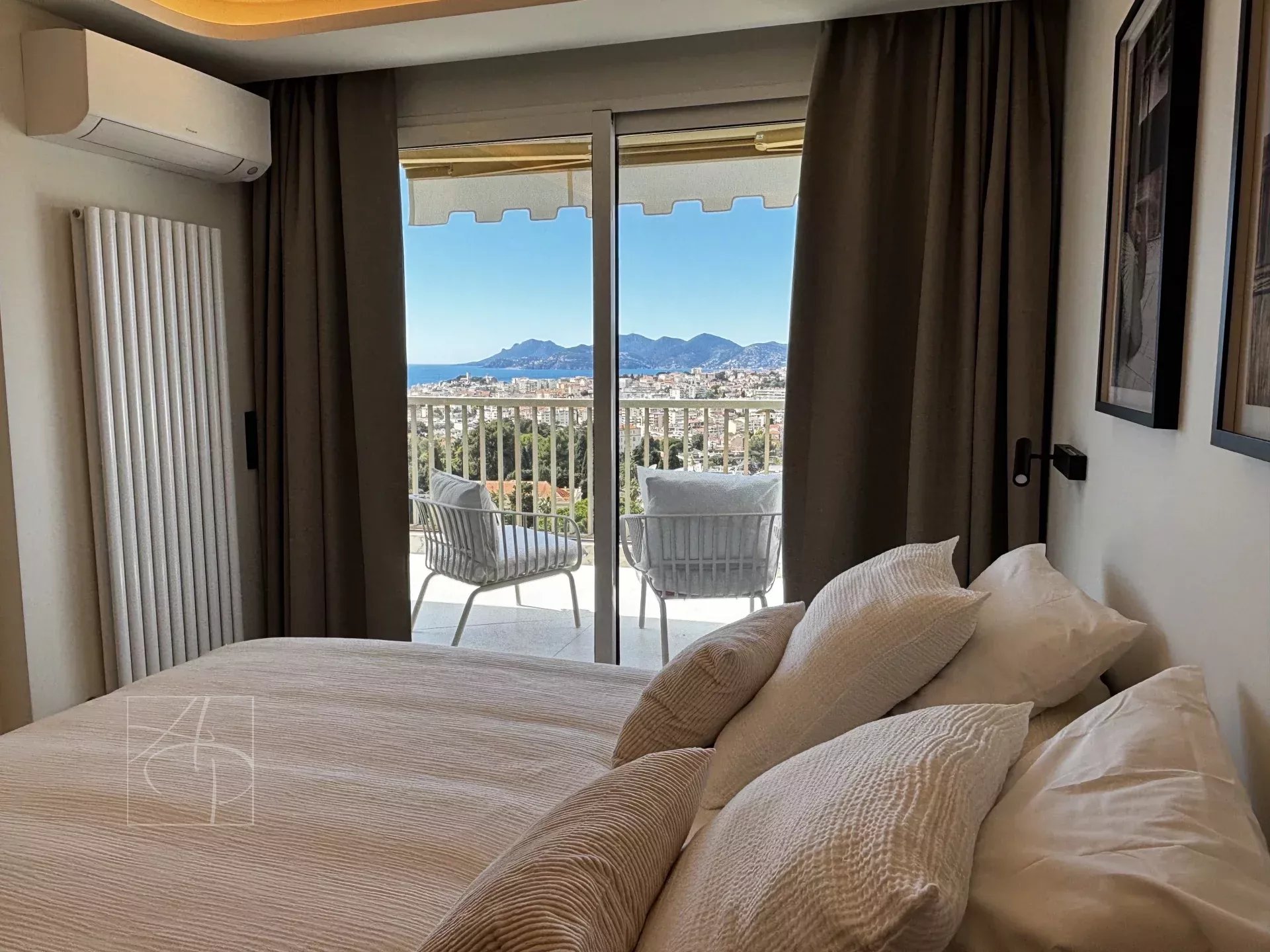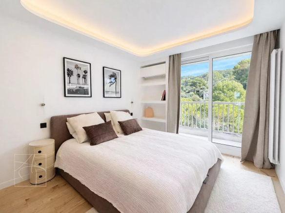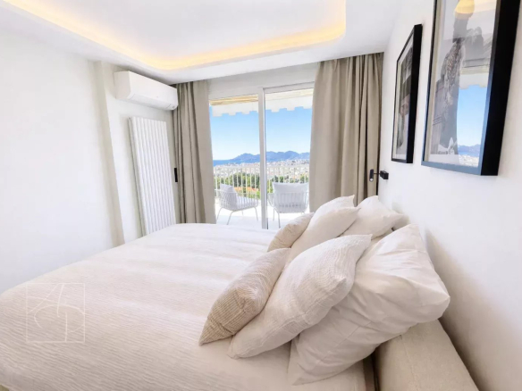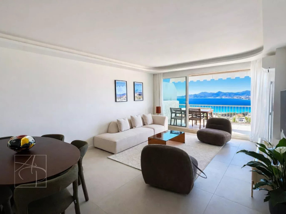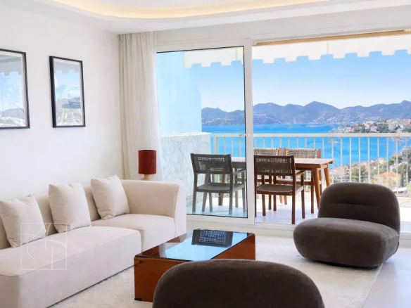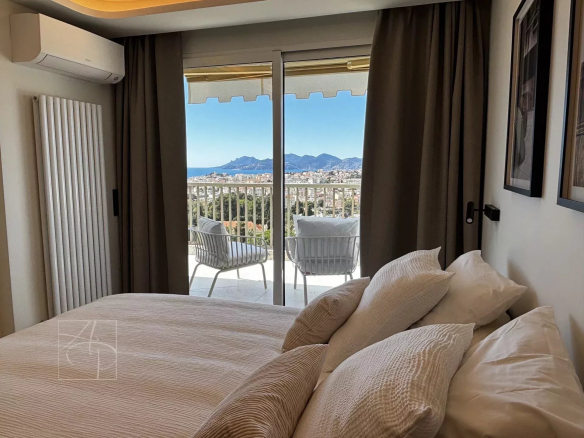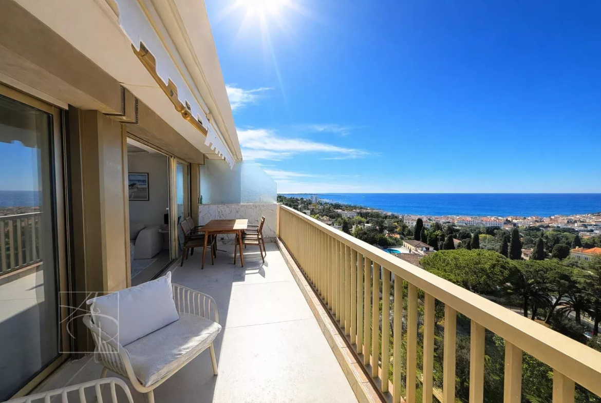 Dans une résidence de standing avec gardien 24-24h, piscine, tennis Sublime 3 pièces entièrement rénové en avant dernier étage traversant avec sa belle terrasse à ciel ouvert exposée sud-ouest. Prestations de qualité , finitions haut de gamme , cet appartement 3 pièces a tout pour vous séduire . Spacieux hall d entrée avec placards de rangement petit coin bureau, un lumineux séjour avec corniche rétro éclairée , ouvert sur une belle terrasse vue mer panoramique des îles de Lerins à L Estérel, une cuisine indépendante dînatoire entièrement équipée avec son coin repas vue verdure au calme absolu . Deux belles chambres une en suite ouverte sur la terrasse vue mer avec coin dressing et placard de rangement salle de douche, salle de bain et une autre ouverte sur un balcon vue verdure avec placard, salle de douche wc, un toilette indépendant avec son lave main . Ensemble entièrement climatisé réglage pièces par pièces . Commodités au pied de la résidence , parking collectif pour les invités avec réception 24-24. Double box au sous sol de la résidence et cave . Proche des commerces cet appartement à tout pour plaire pour s y installer en résidence principal ou secondaire .