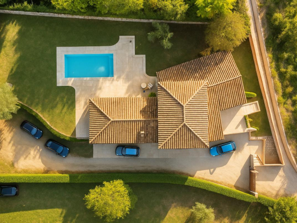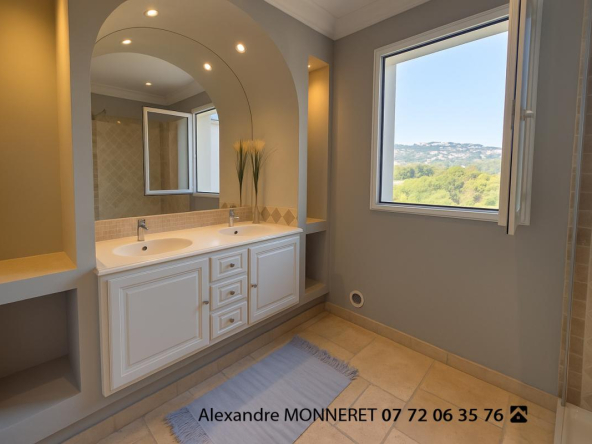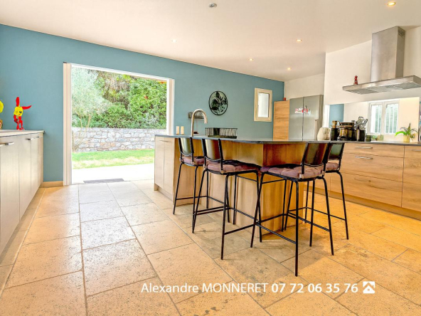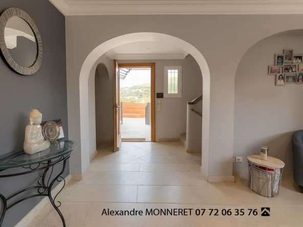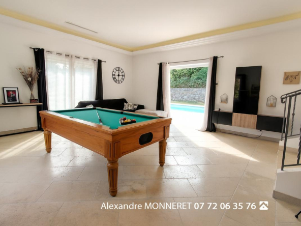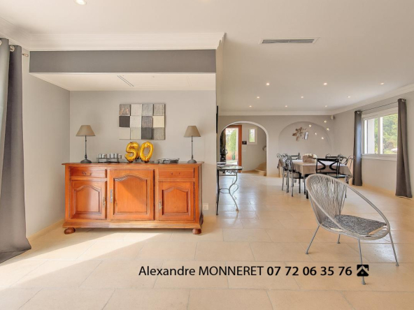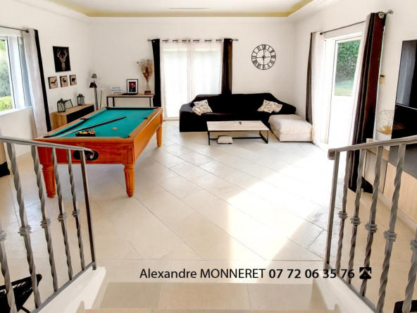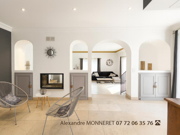 Quelques prestations : – Cheminée double foyer – Climatisation gainable réversible – Menuiseries à galandage – Domotique pour les volets roulants – Fibre installée dans la maison – Tout-à-l’égout – Terrain entièrement cloturé – Chambre de plain pied