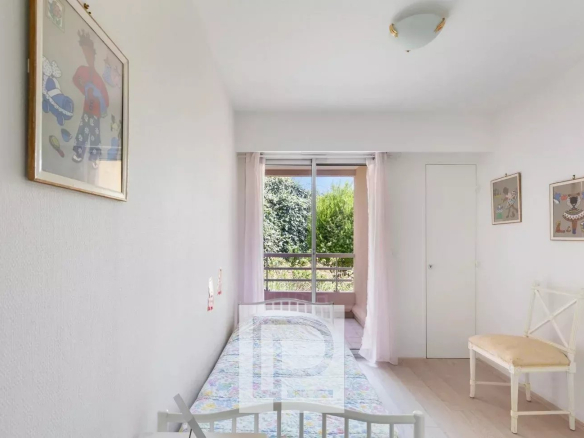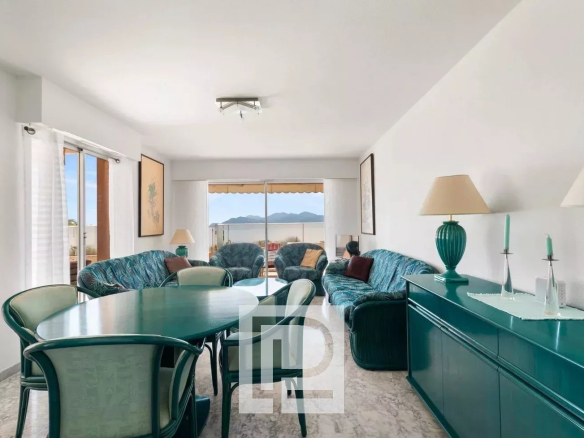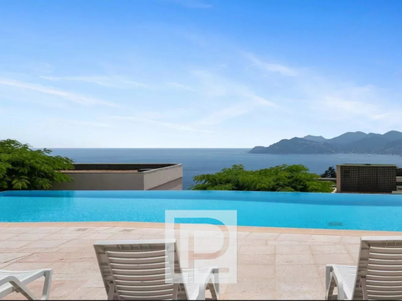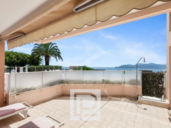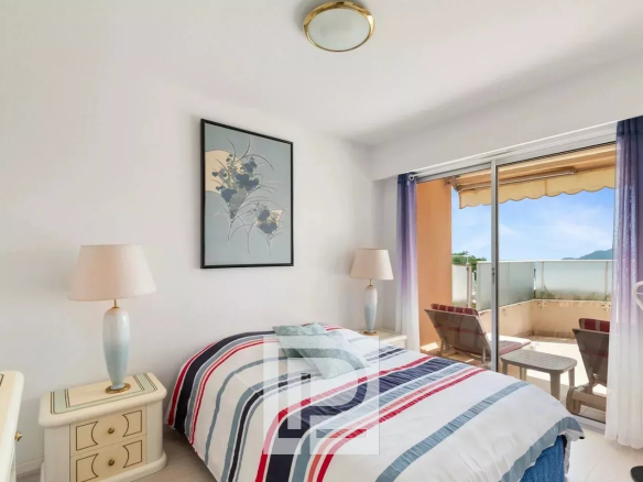 Appartement 3 pièces de 74m² et niché dans la verdure offrant une partie living donnant sur une agréable terrasse de 38m² avec vue mer et un accès direct à la piscine, 2 chambres et 2 salles d’eau.