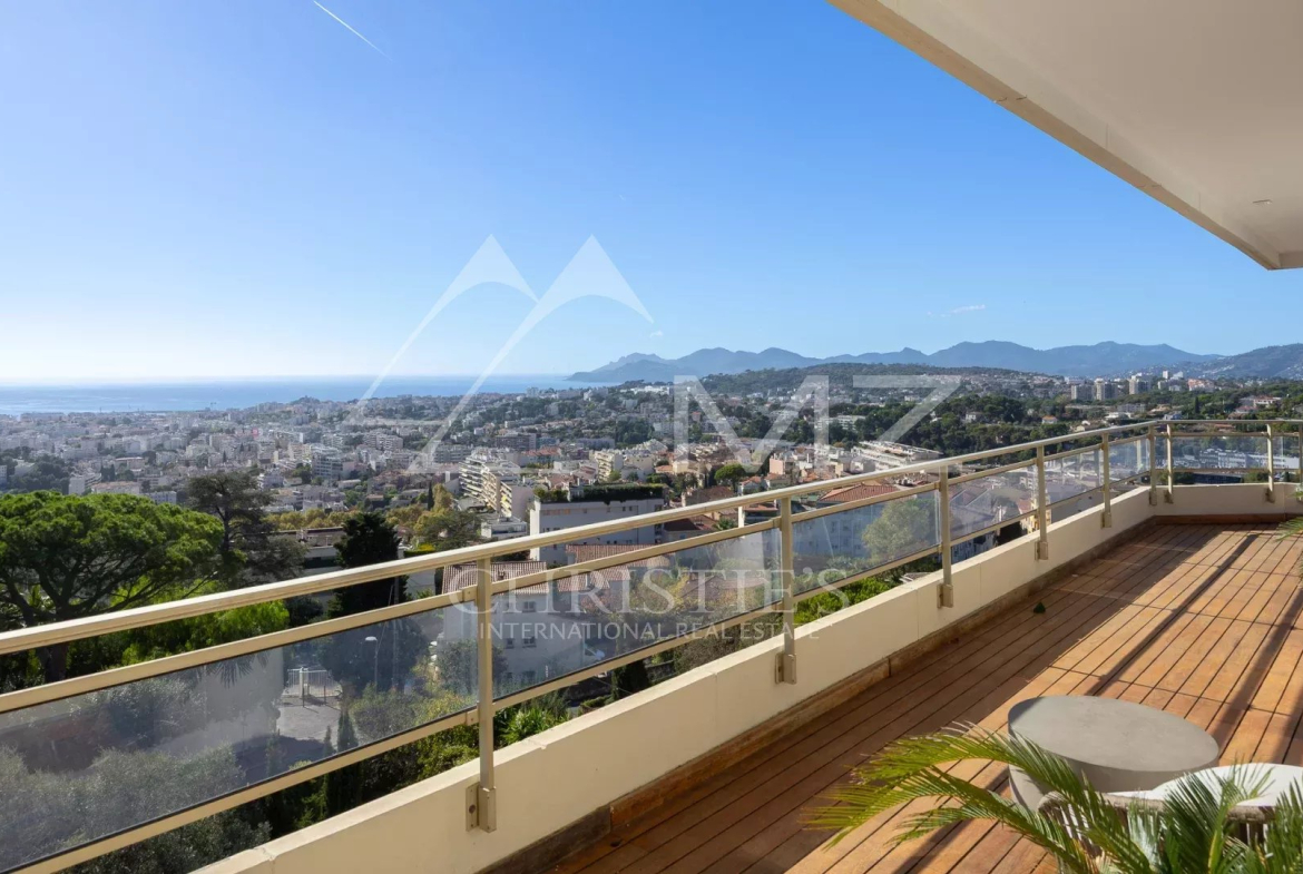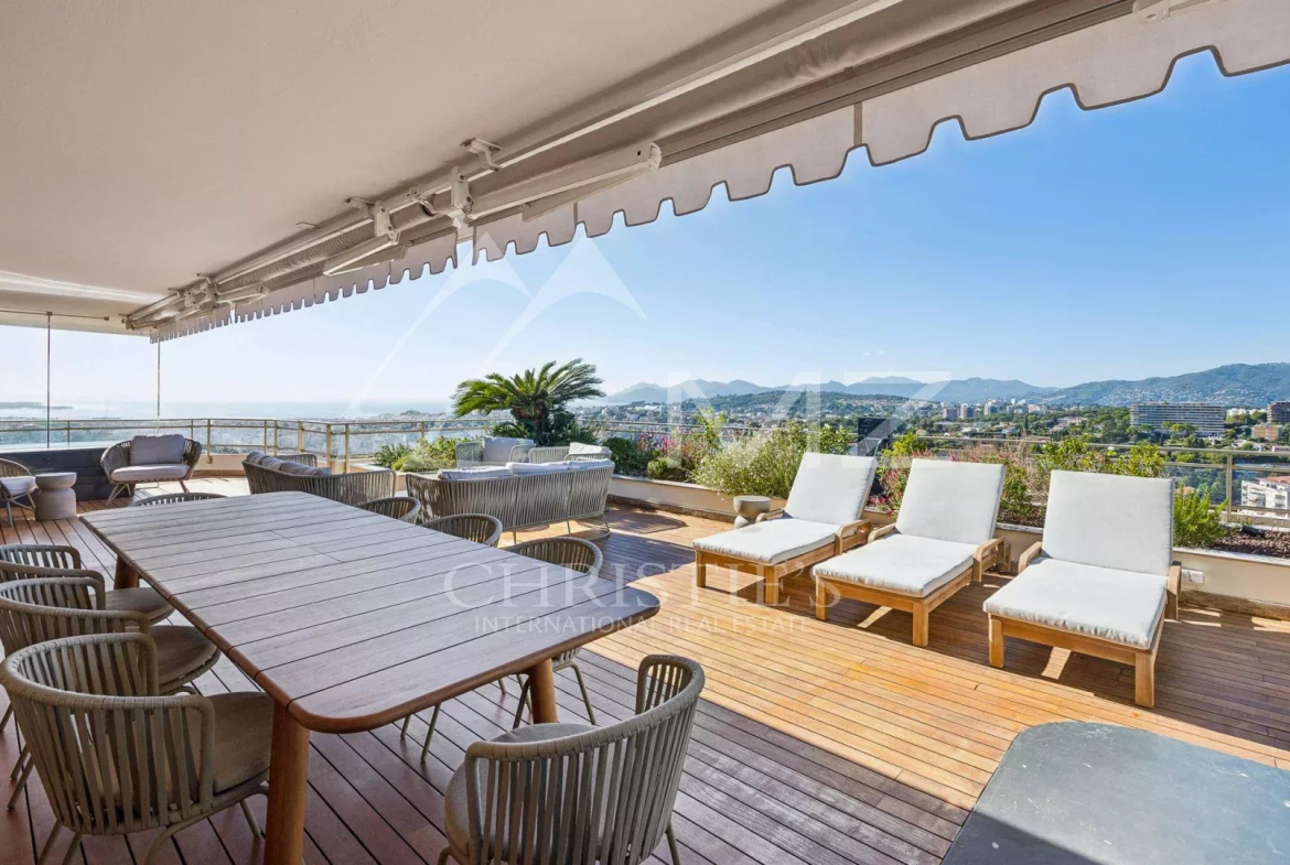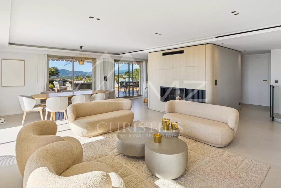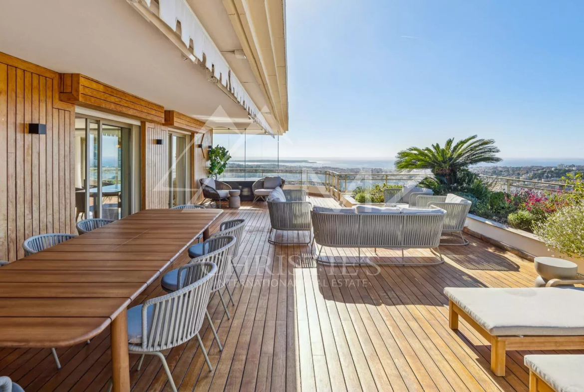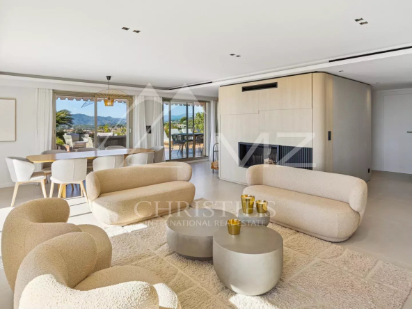 Penthouse de 185 m² entièrement rénové, offrant des prestations raffinées et une grande terrasse de 150 m² avec une vue panoramique sur la mer et l’Estérel. Accessible par un ascenseur privatif, cet espace de vie lumineux se compose d’un vaste séjour orné de larges baies vitrées, permettant de profiter pleinement de la vue imprenable. Une belle cheminée ajoute une touche chaleureuse à cet espace.