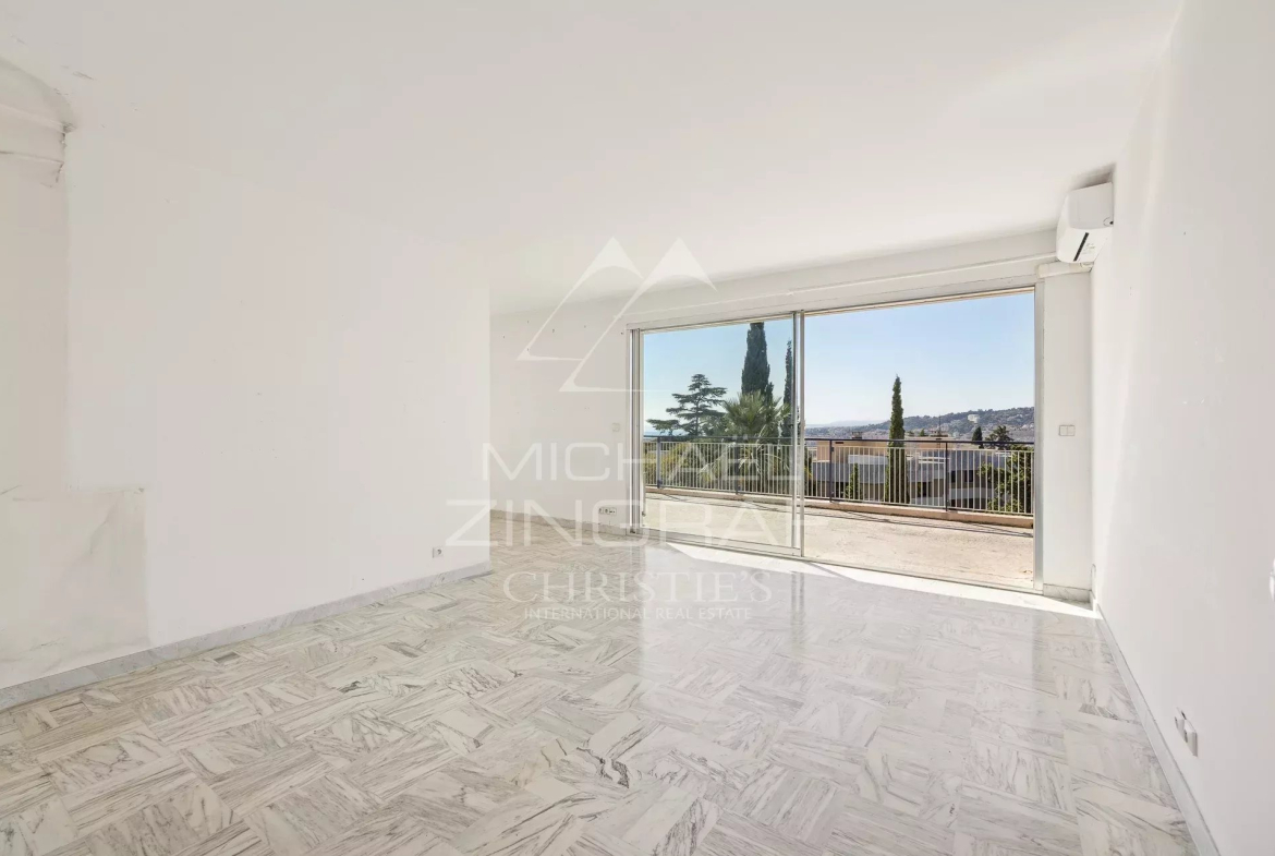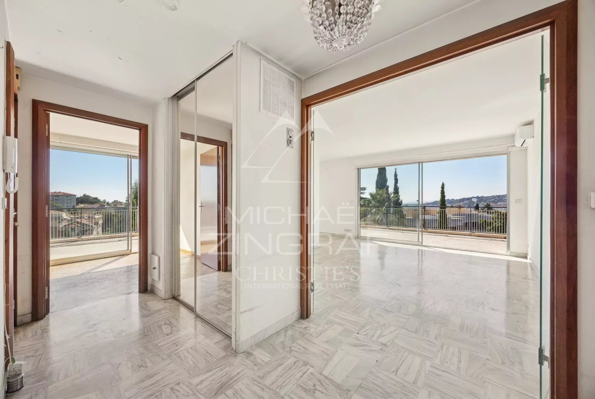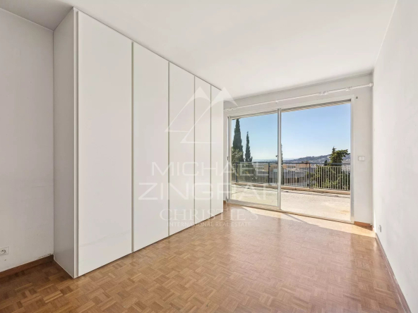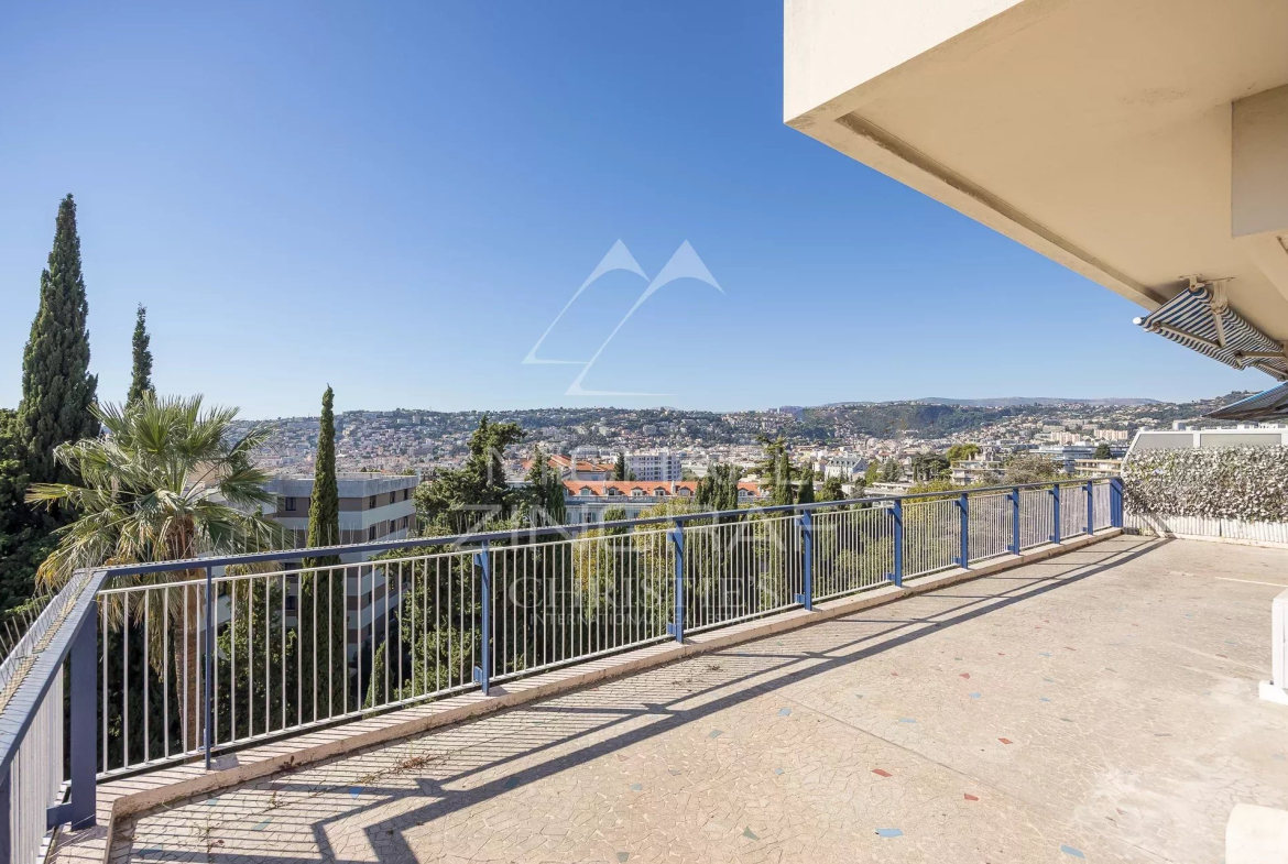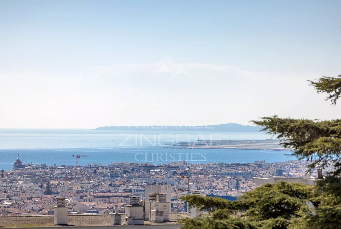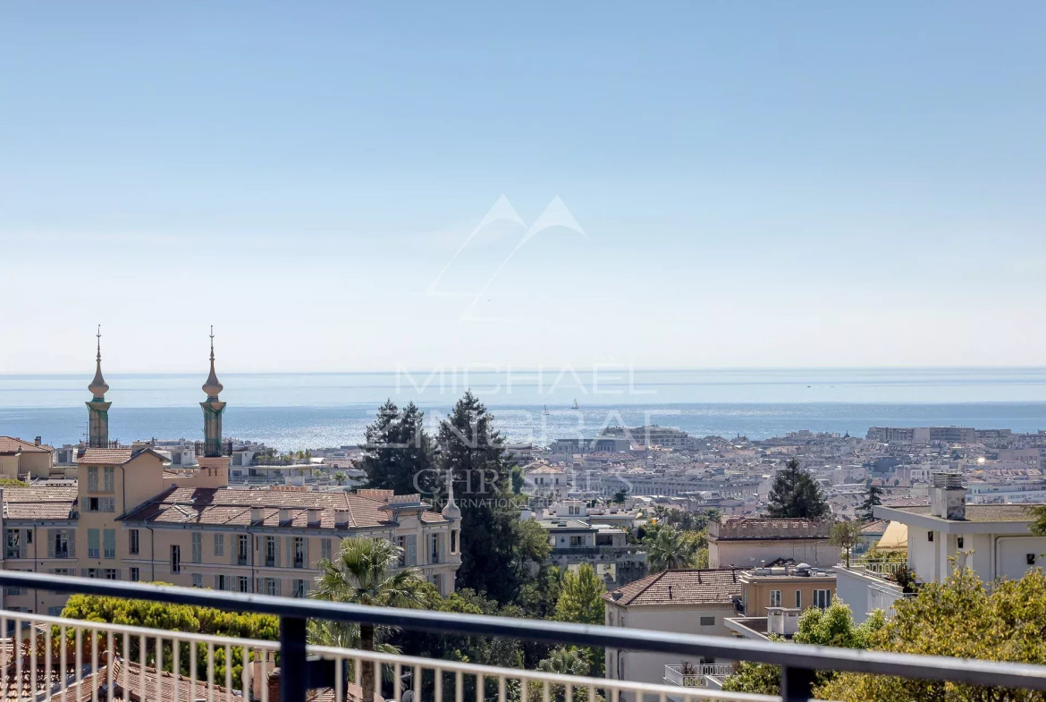 Une terrasse de 115 m² offre une vue panoramique sur la mer, la ville et les collines niçoises. Toutes les pièces ont un accès direct à l’extérieur.