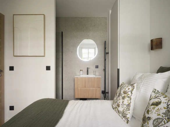 Les deux chambres, chacune avec leur salle d’eau, offrent confort et intimité dans une ambiance raffinée.