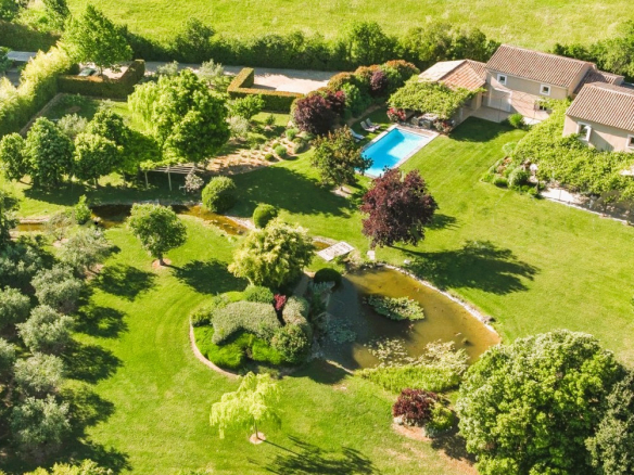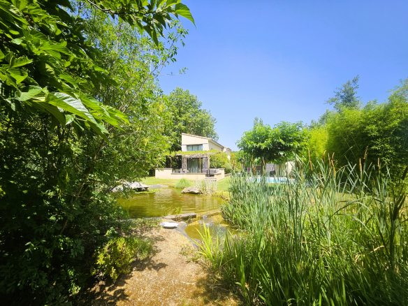 Implanté sur un terrain paysager de 7 890 m2, le domaine développe une surface habitable d’environ 447 m2, organisée autour de jardins arborés soigneusement entretenus, de bassins d’ornement reliés par un cours d’eau et de terrasses ombragées propices à la détente.