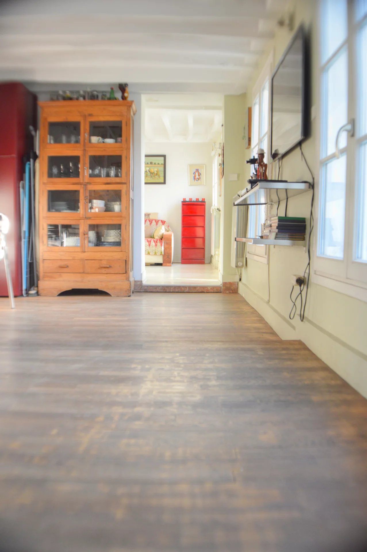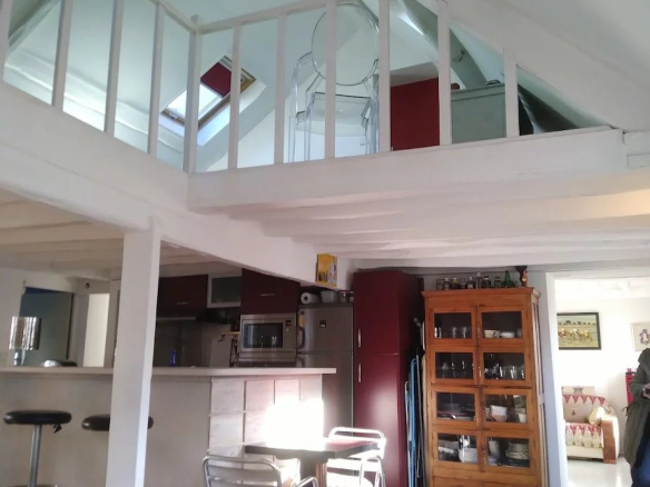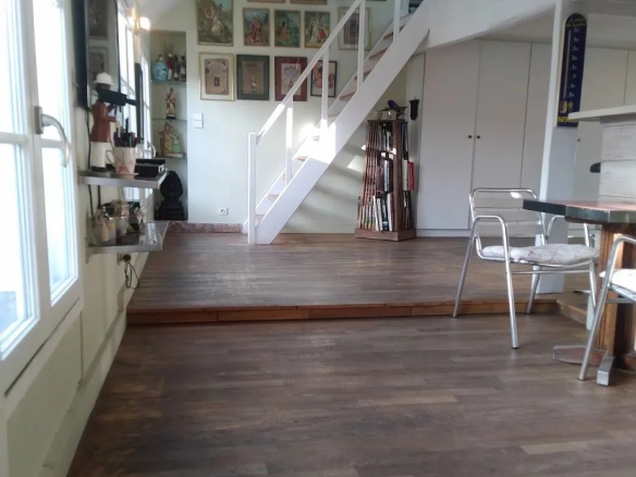 On accède par un escalier intérieur à une entrée qui mène à une vaste cuisine / salle à manger et un double salon de réception. L’ensemble bénéficiant de nombreuses fenêtres donnant sur une grande terrasse. Un deuxième niveau offre une spacieuse chambre avec une grande salle de bain (baignoire, douche, WC, rangements)