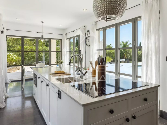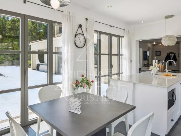 En prolongement des espaces de vie, une vaste cuisine d’été entièrement équipée invite à la convivialité et donne accès à une piscine chauffée au sel, bordée d’une terrasse.