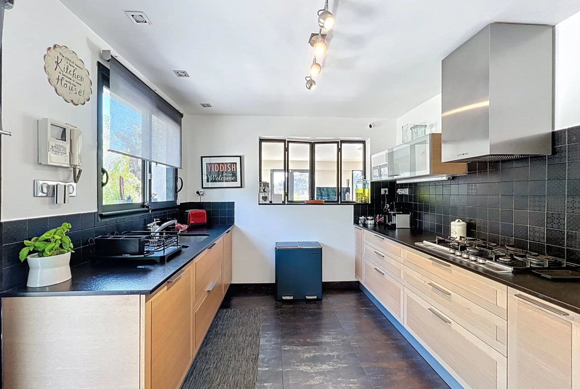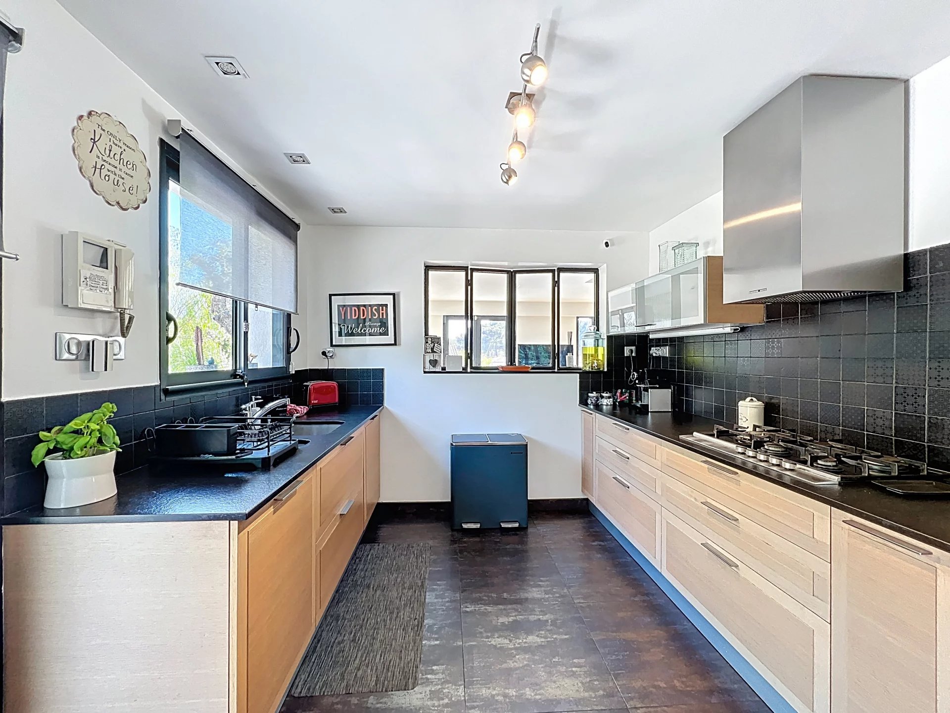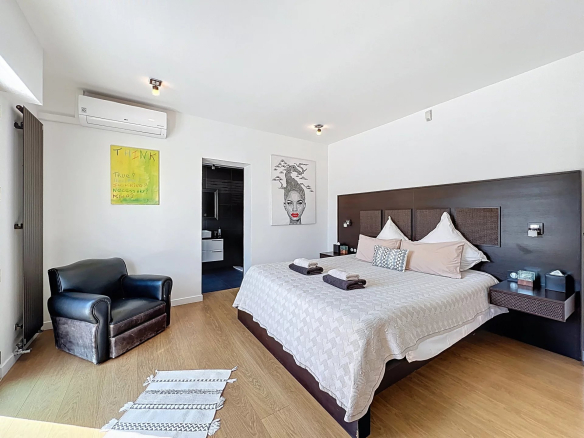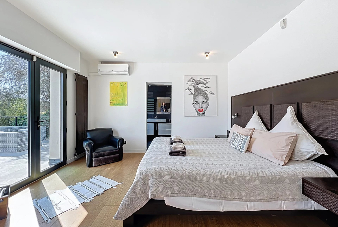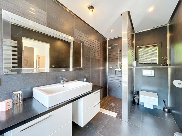 Au niveau principal (supérieur), la maison offre un vaste séjour lumineux avec salon et salle à manger, une cuisine indépendante entièrement équipée, ainsi qu’une grande arrière-cuisine faisant office de buanderie et espace de stockage. La suite parentale se compose d’un grand dressing, d’une salle de bains avec baignoire, douche et WC, ainsi que d’une pièce bureau et un un WC invité. Toutes les pièces ouvrent sur une spacieuse terrasse exposée plein sud, ensoleillée toute la journée, avec vue sur la piscine et le jardin.