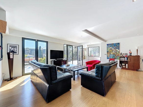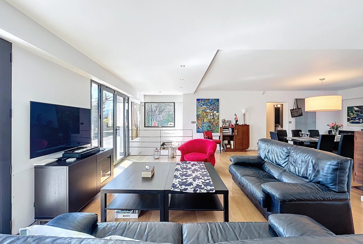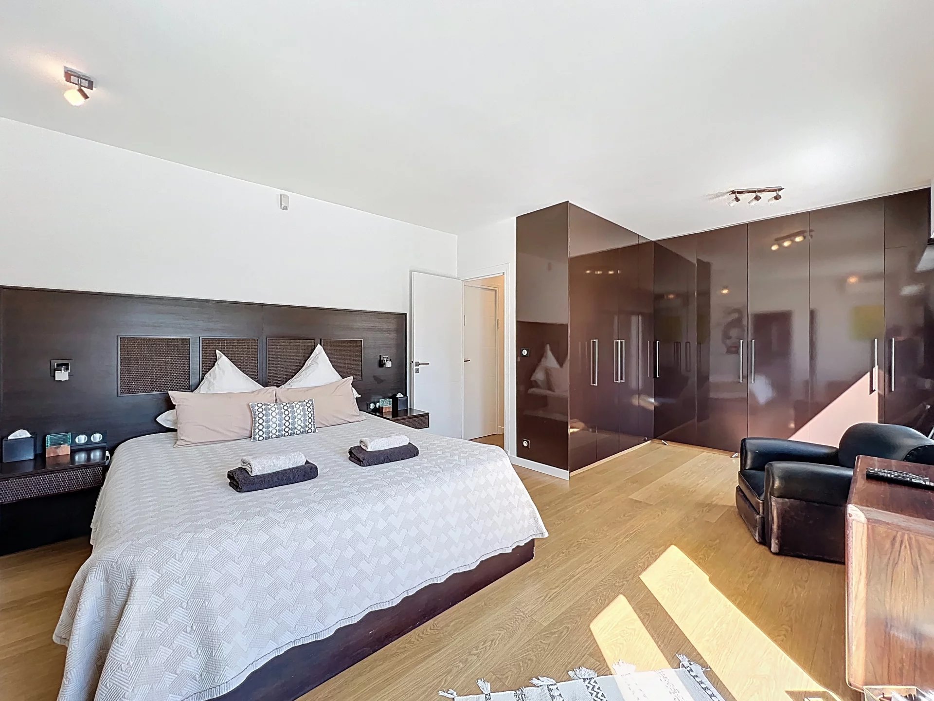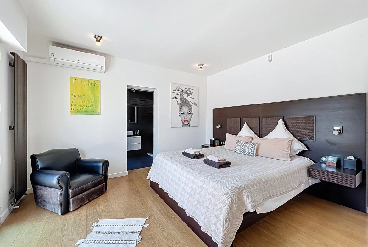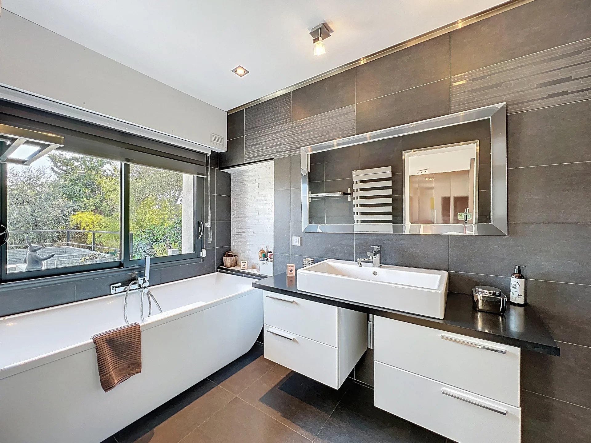 Au niveau principal (supérieur), la maison offre un vaste séjour lumineux avec salon et salle à manger, une cuisine indépendante entièrement équipée, ainsi qu’une grande arrière-cuisine faisant office de buanderie et espace de stockage. La suite parentale se compose d’un grand dressing, d’une salle de bains avec baignoire, douche et WC, ainsi que d’une pièce bureau et un un WC invité. Toutes les pièces ouvrent sur une spacieuse terrasse exposée plein sud, ensoleillée toute la journée, avec vue sur la piscine et le jardin.