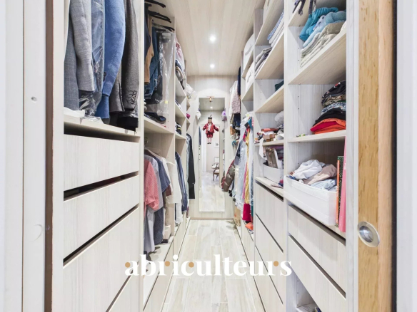 L’aile principale dessert une première chambre avec vue sur le jardin et sa salle d’eau. À l’opposé, la suite parentale dévoile un confort total avec son dressing sur mesure et sa salle de bains complète (douche et baignoire).