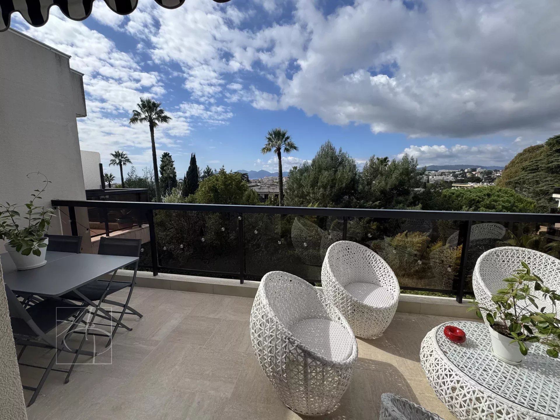 ce splendide appartement de 75m2 traversant, exposé sud ouest, bénéficie de 2 terrasses profondes de 14m2 chacune avec la vue sur le parc de la résidence, un très bel aperçu mer et estérel