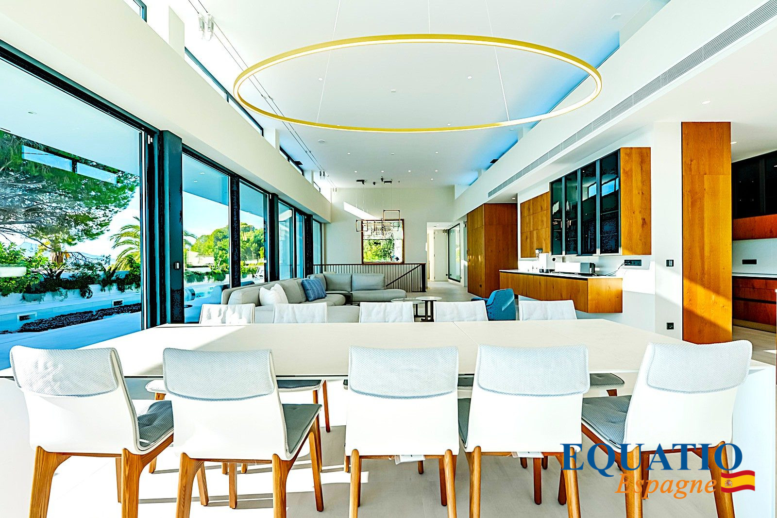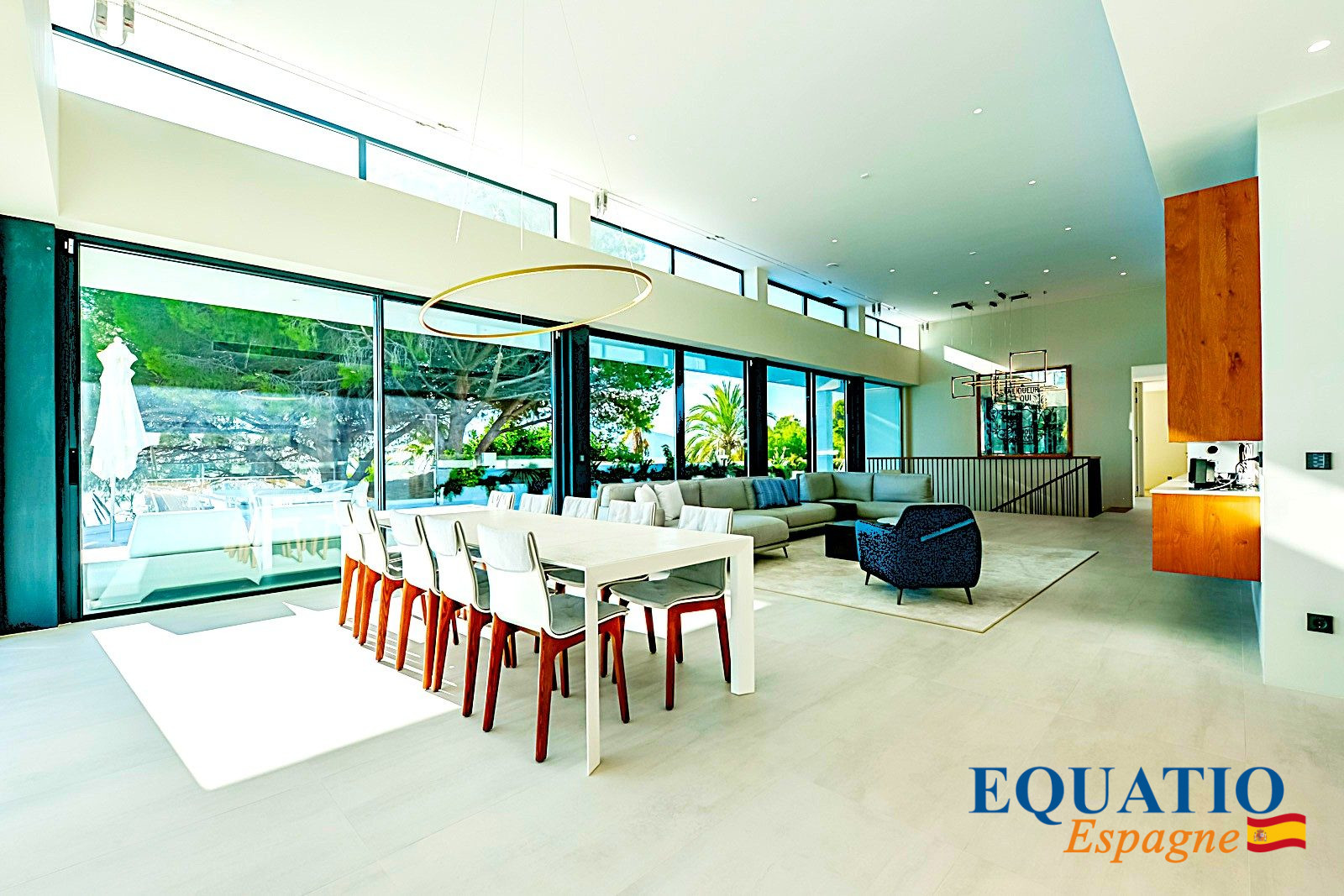 IMMENSE pièce principale avec une hauteur sou plafond d’environ 4,5 mètres pour accueillir le salon, la salle à manger et la Cuisine Américaine semi-ouverte complétement Aménagée et Equipée avec des appareils électroménagers de haute qualité, et équipé de son îlot central.