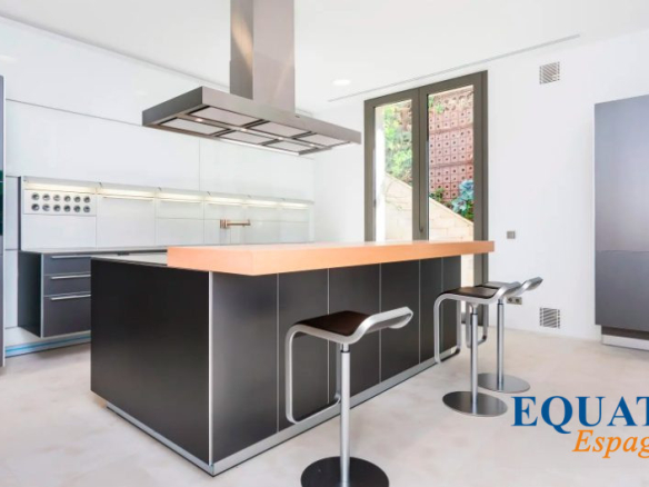 VILLA PRINCIPALE de 780 m² avec son Ascenseur, 4 chambres confortables avec dressing, 4 salles de bains, 1 salle de bains ‘ Visiteurs ‘, salon avec Cheminée, cuisine ouverte Aménagée et Equipée, avec son îlot séparé de la salle à manger, par une porte coulissante en verre.