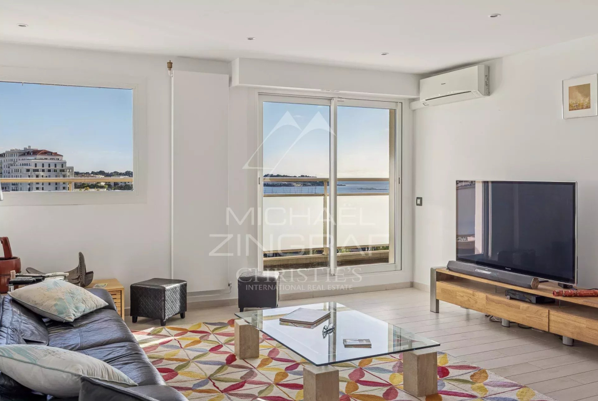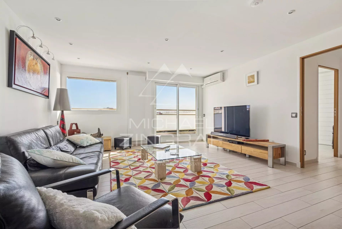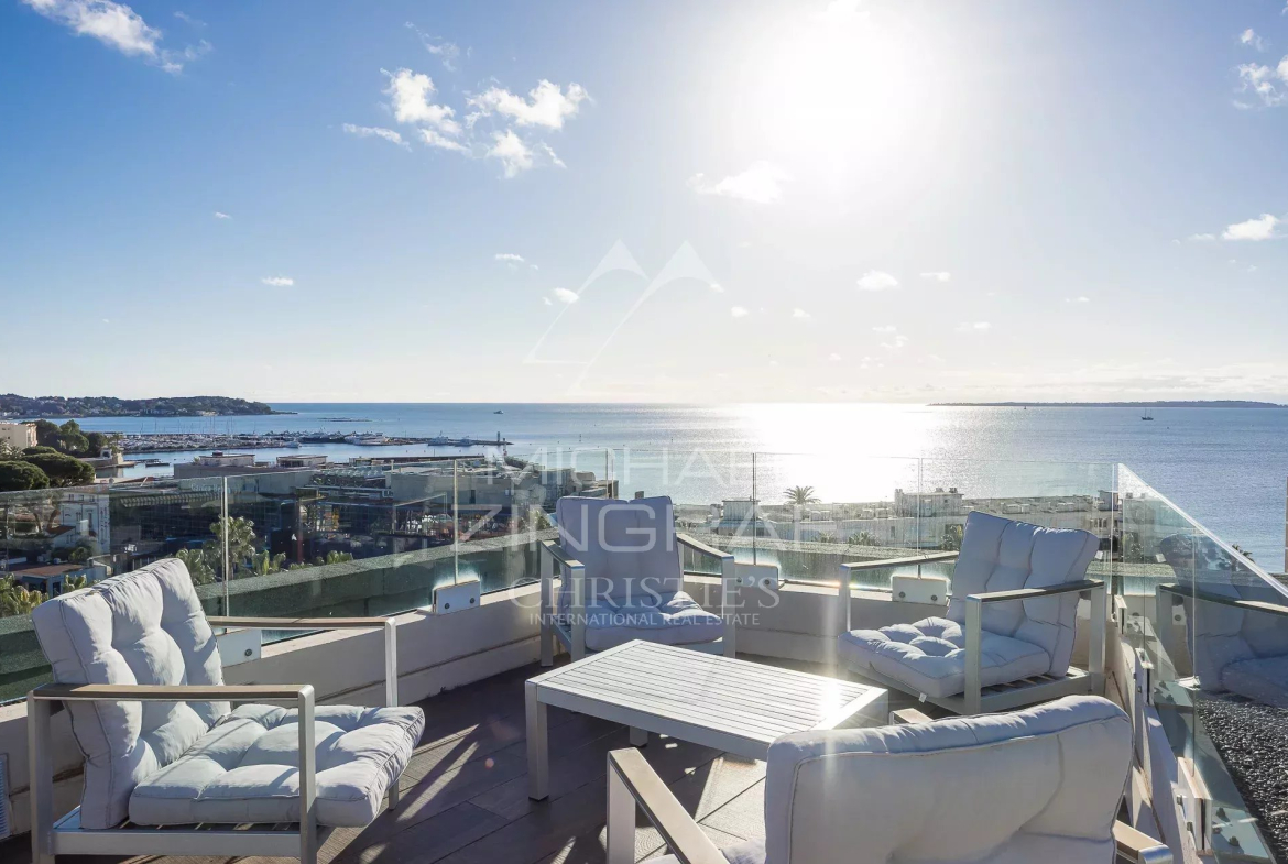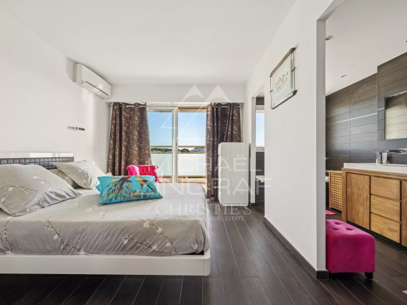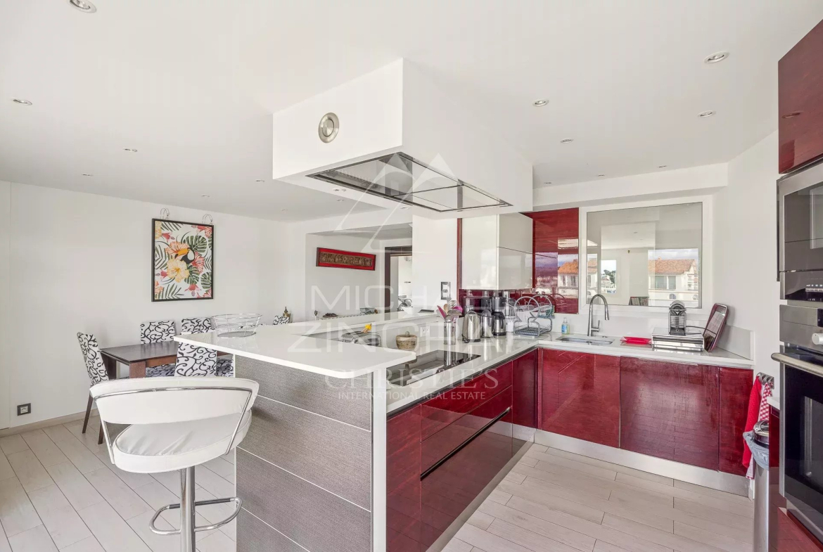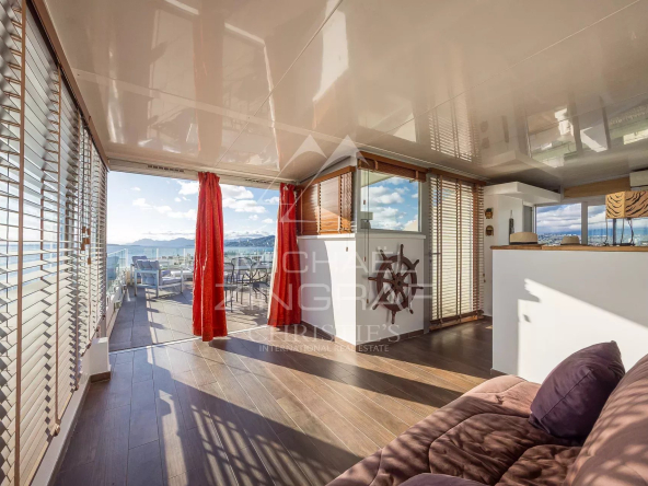 Idéalement situé en hypercentre de Juan-les-Pins, au dernier étage d’un immeuble de standing sécurisé et gardienné, ce toit-terrasse d’exception offre une vue mer panoramique à 180° et des prestations de grande qualité