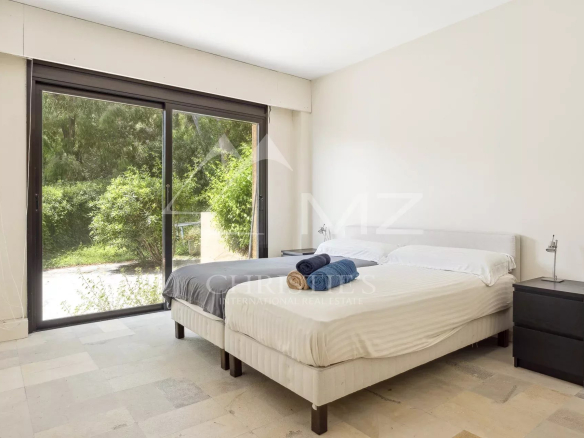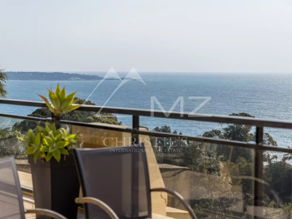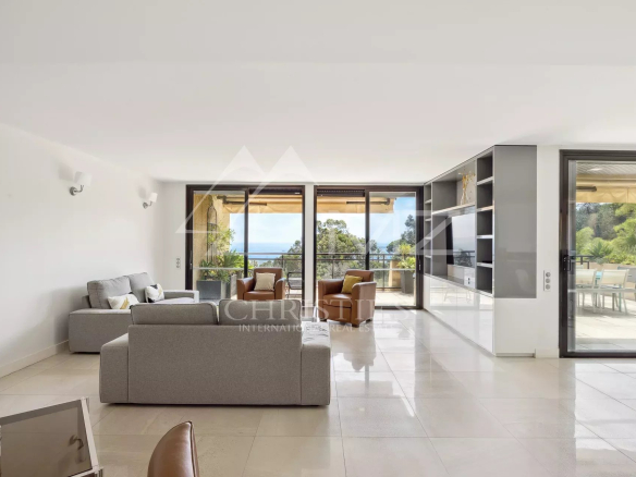 Ce bien d’exception se distingue par son esprit contemporain et son excellent état. Le vaste séjour-salle à manger de 70 m² s’ouvre sur une terrasse avec une vue panoramique imprenable sur la mer Méditerranée et les îles de Lérins, créant un cadre de vie idyllique.
