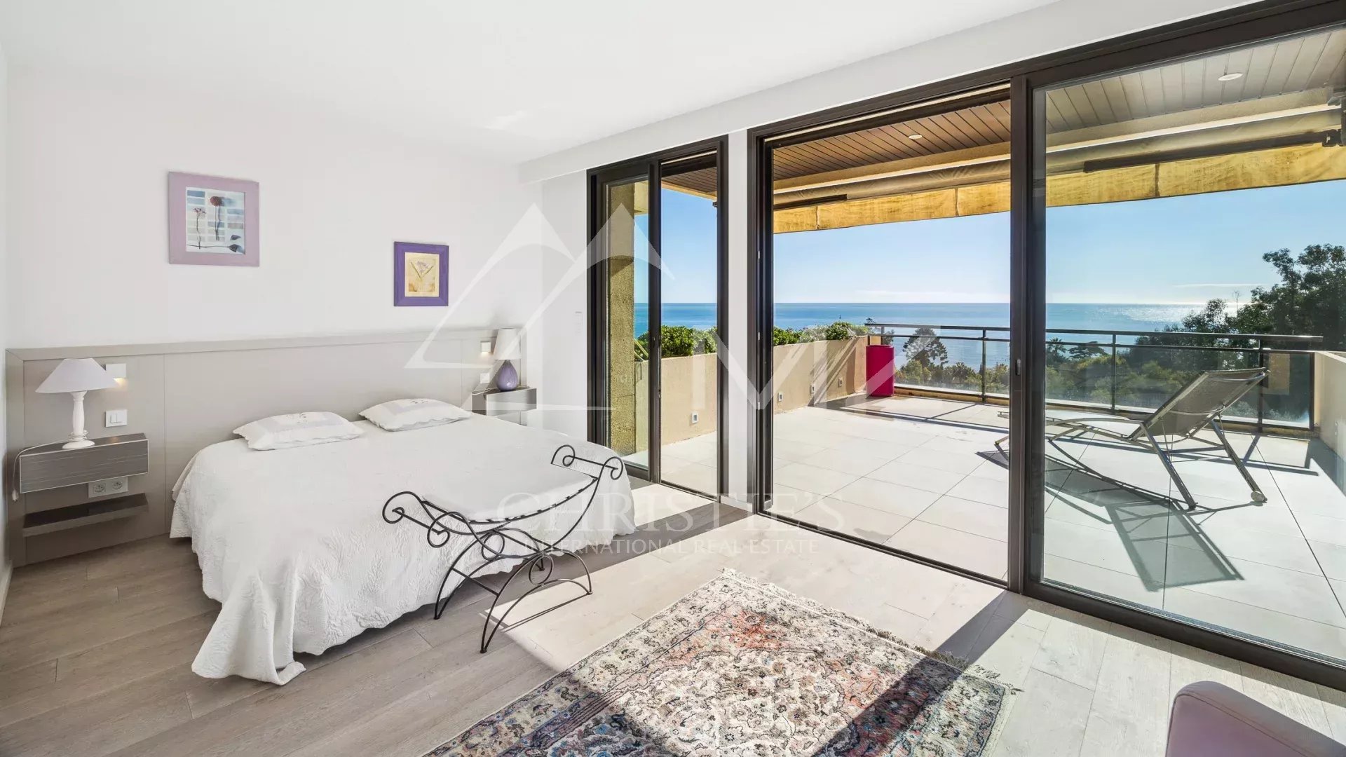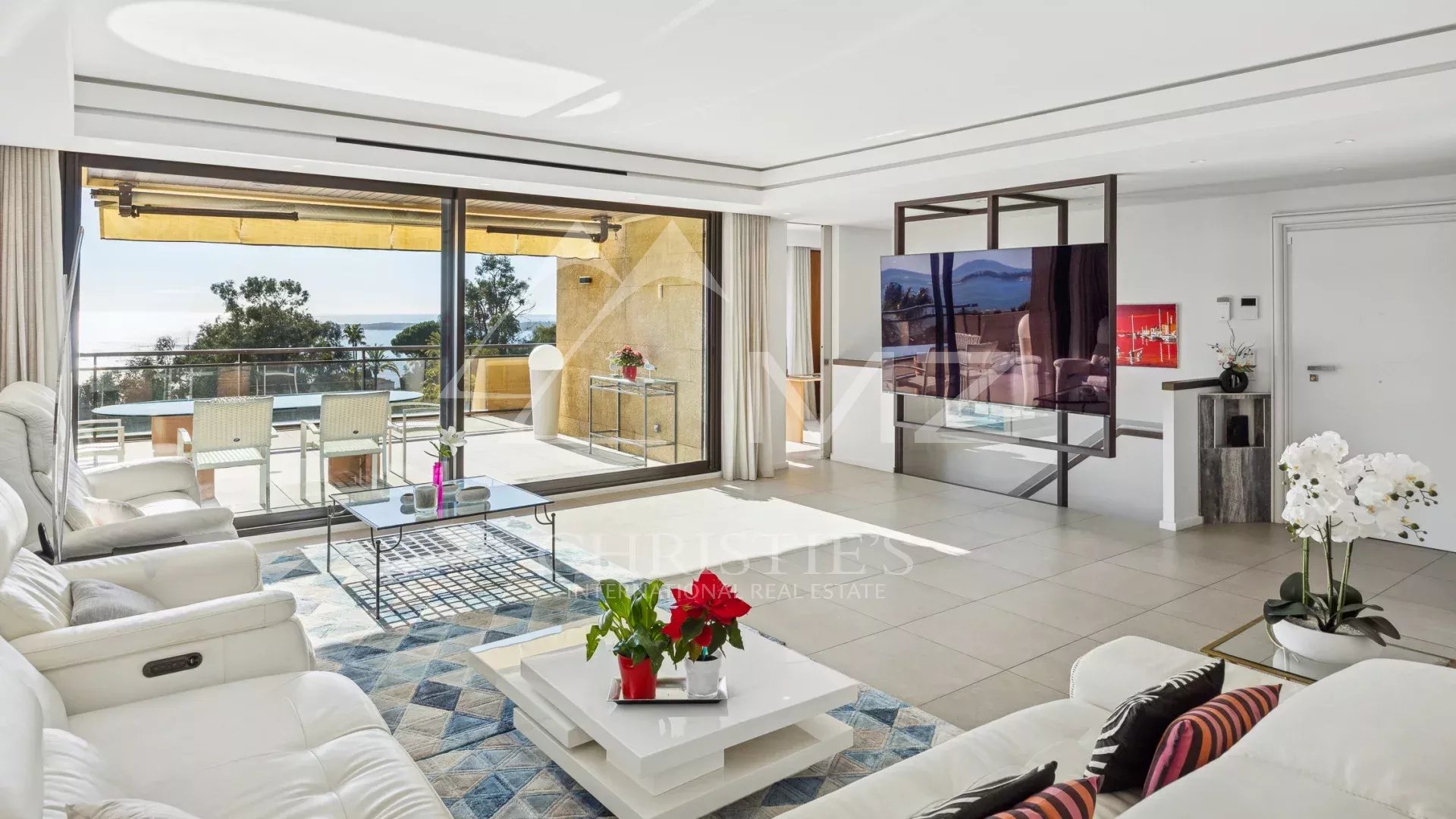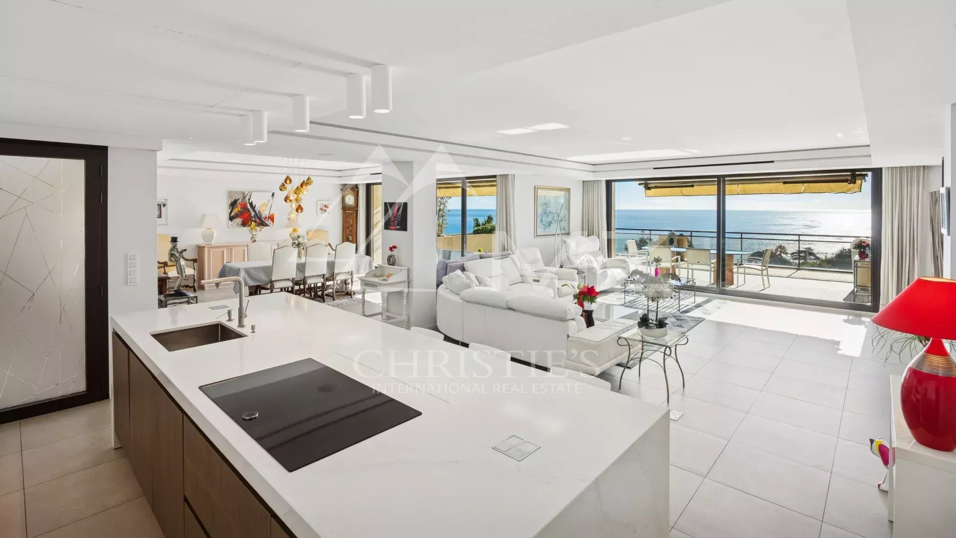 Ce bien d’exception se distingue par son esprit contemporain et son excellent état. Le vaste séjour-salle à manger de 98 m² s’ouvre sur une terrasse avec une vue panoramique imprenable sur la mer Méditerranée et les îles de Lérins, créant un cadre de vie idyllique.