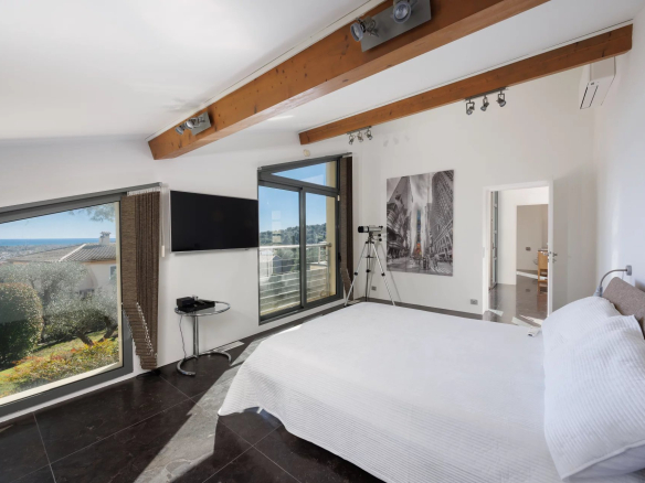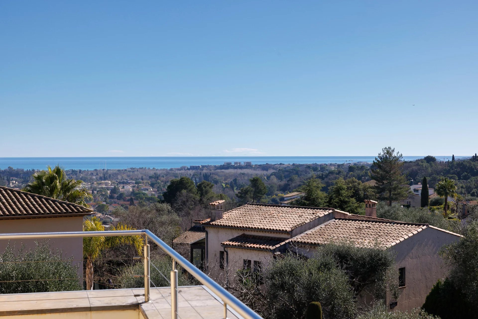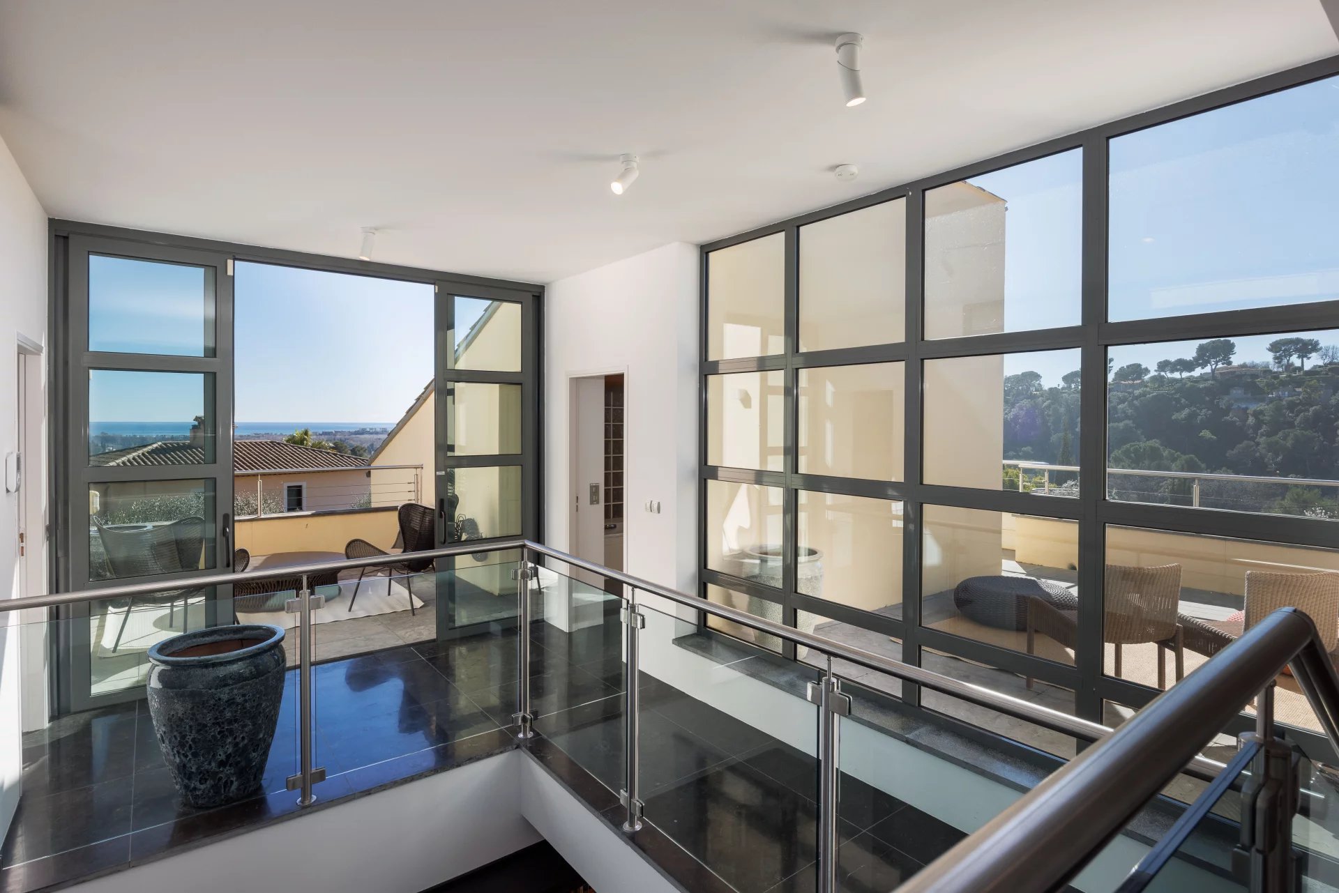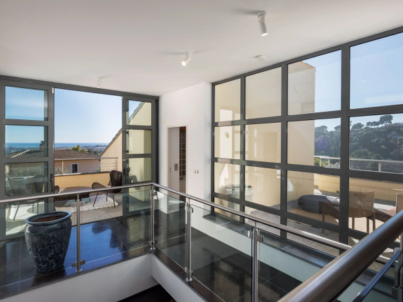 Un élégant escalier dont la conception donne une impression d’atrium aérien et élégant, mène au deuxième étage de la villa. Il y a deux autres chambres (respectivement 21 et 17 m²), une salle de douche avec toilettes et une salle de bains avec toilettes. A cet étage, trois terrasses orientées dans toutes les directions avec des accès depuis l’atrium et/ou les chambres offrent une belle vue sur le village de Biot et la mer Méditerranée.