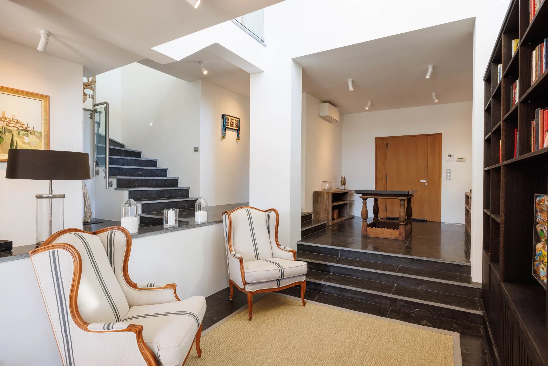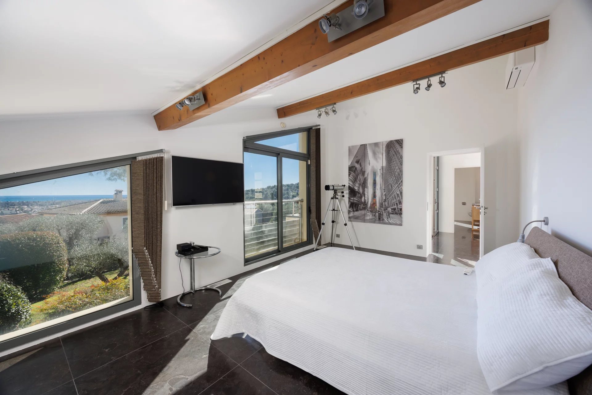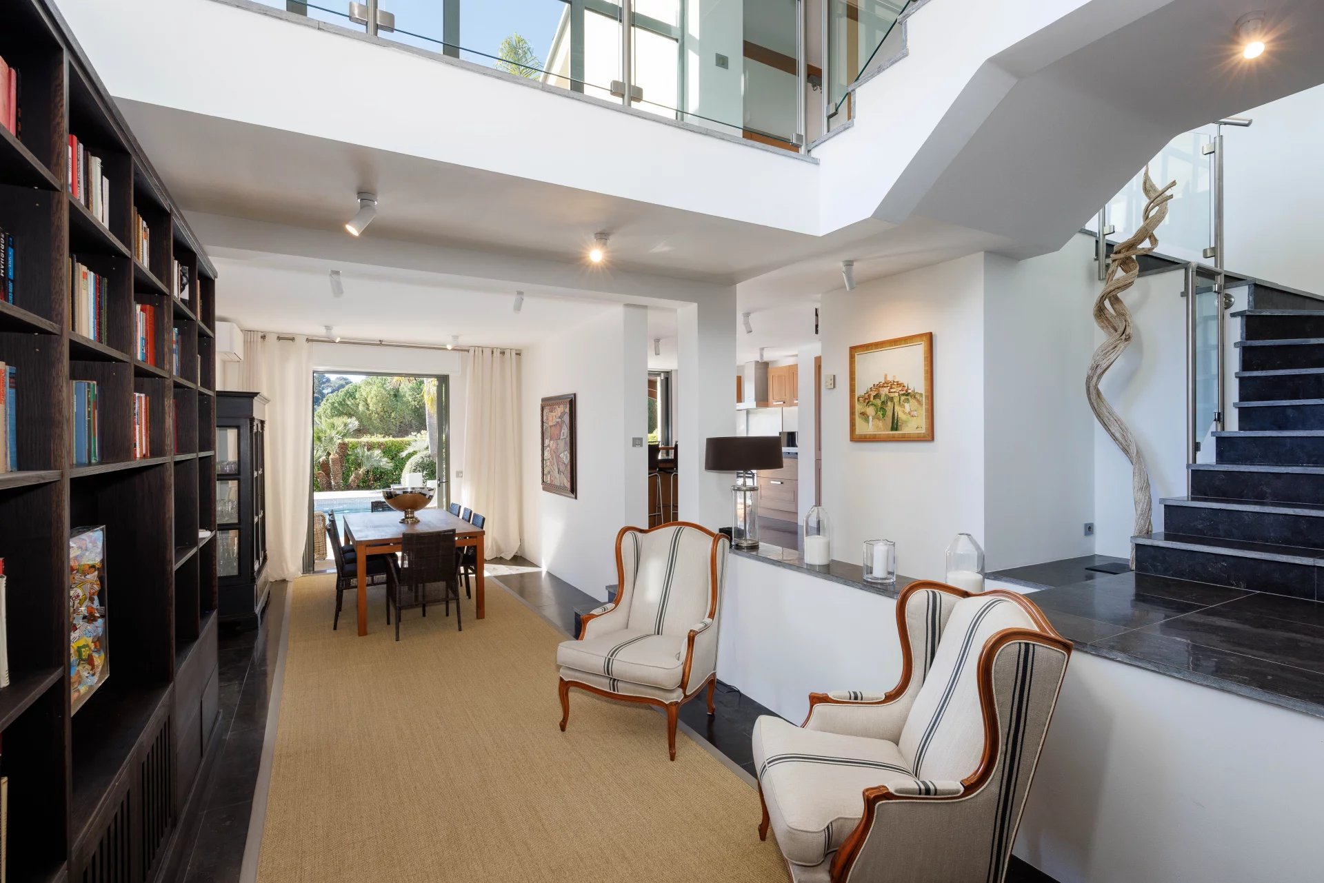 Un élégant escalier dont la conception donne une impression d’atrium aérien et élégant, mène au deuxième étage de la villa. Il y a deux autres chambres (respectivement 21 et 17 m²), une salle de douche avec toilettes et une salle de bains avec toilettes. A cet étage, trois terrasses orientées dans toutes les directions avec des accès depuis l’atrium et/ou les chambres offrent une belle vue sur le village de Biot et la mer Méditerranée.