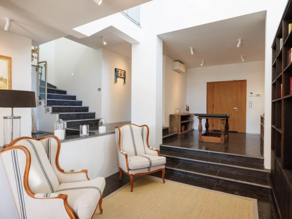 La villa a une surface habitable nette de 235 m² (surface utile 257 m²) et se compose d’un hall d’entrée spacieux (12 m²) qui mène à une salle à manger (26 m²), une cuisine entièrement équipée, partiellement ouverte (20 m²) et à un salon lumineux avec cheminée (35 m²). La salle à manger et la cuisine s’ouvrent par de grandes baies vitrées coulissantes à galandage, donnant sur la terrasse, la piscine et un bel espace « pool-house » couvert et intime. A ce niveau se trouvent également deux chambres (respectivement 14 et 15 m² – dont une actuellement aménagée en salle de sport), une salle de bain avec baignoire et toilettes et une salle de douche avec toilettes. Une buanderie complète cet étage. Depuis les chambres, on accède au jardin.