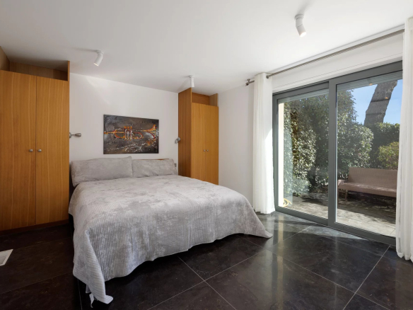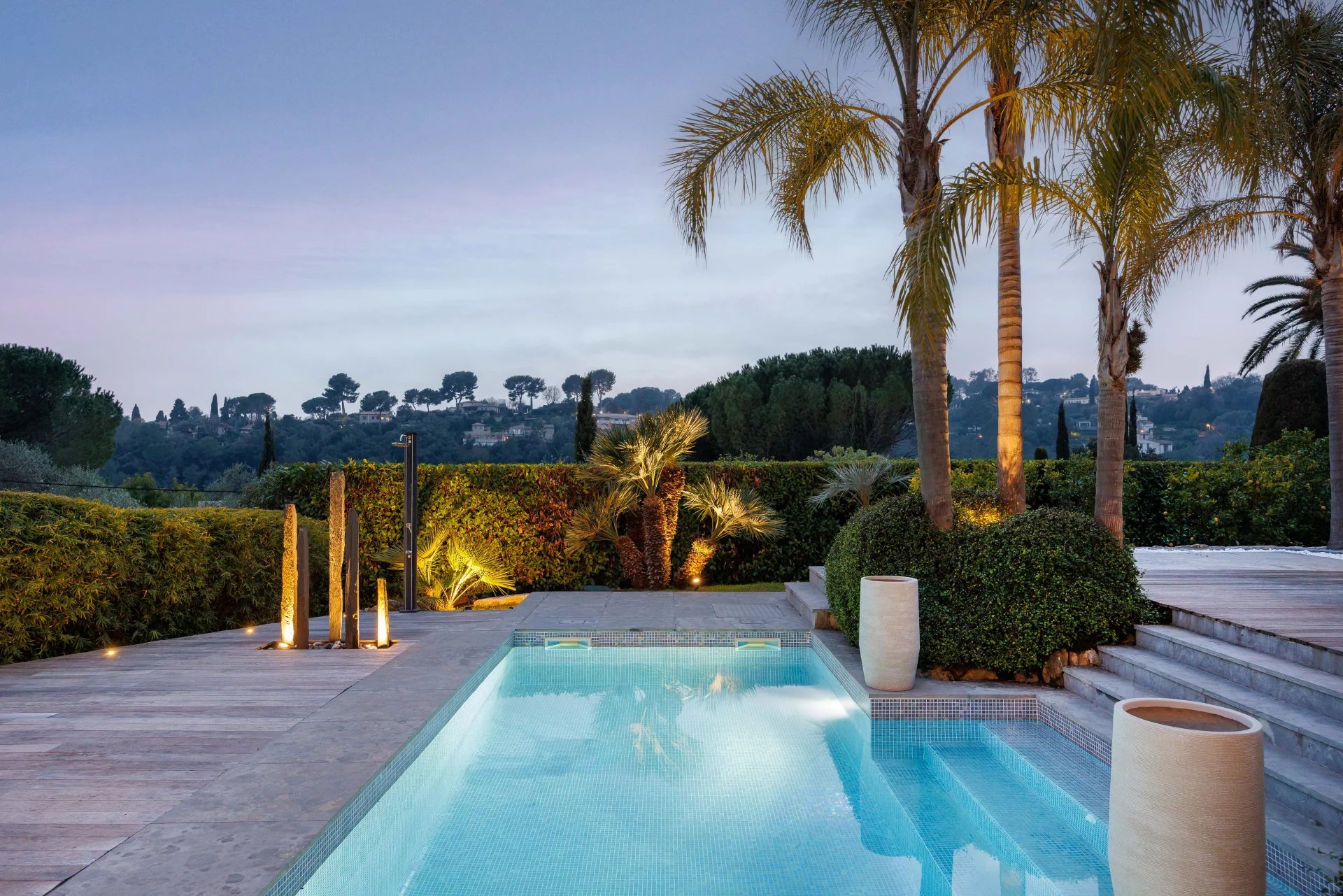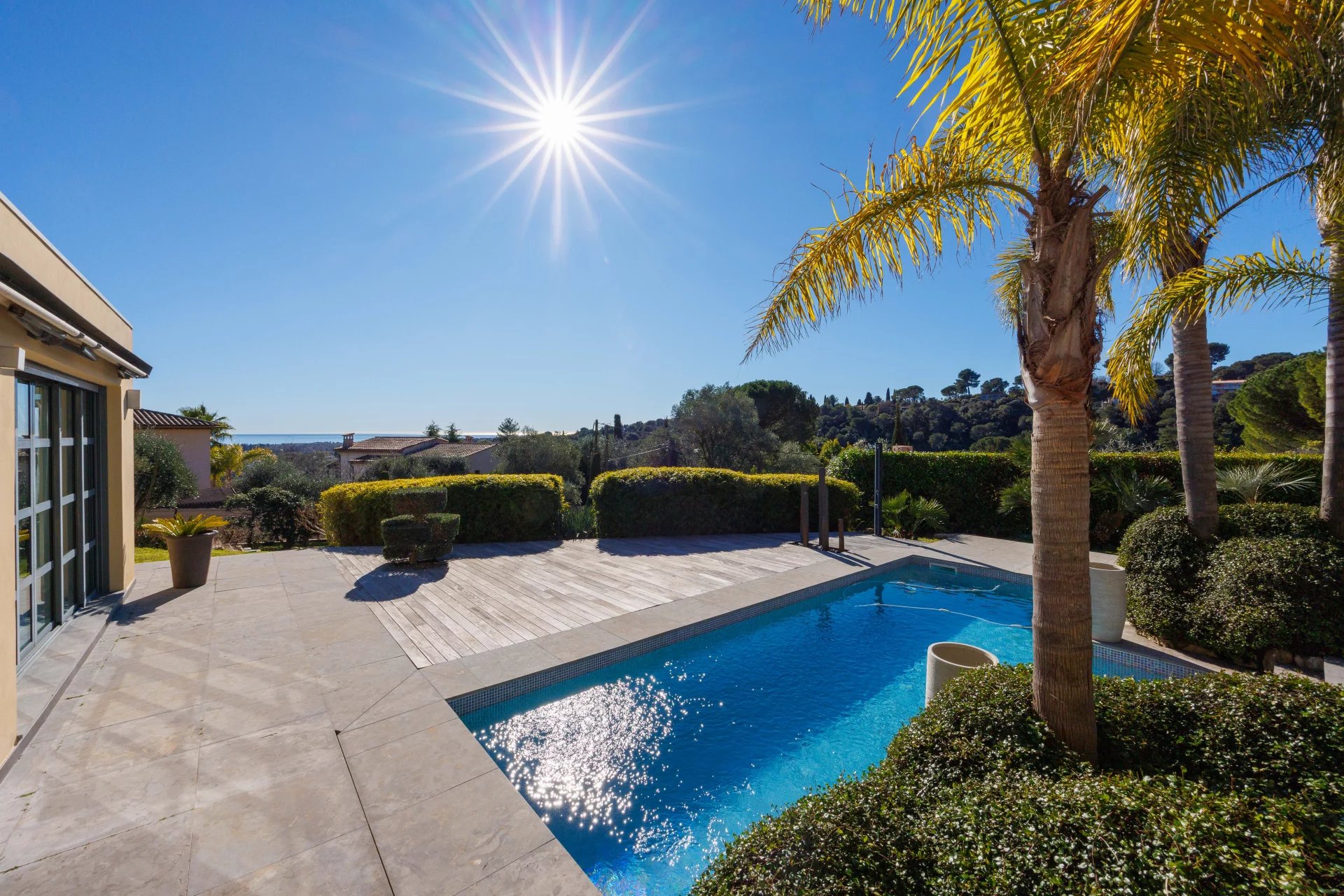 Le terrain (2013m²) est clôturé et sur deux niveaux. Le niveau supérieur, directement à l’extérieur du salon de la maison, est en partie carrelé et en partie revêtu de bois autour d’une belle piscine de 3 x 8 mètres avec douche extérieure. Au-dessus de la piscine se trouve un pool house sous la forme d’une structure à la courbe élégante et propose beaucoup d’espace pour une table longue et un coin transat. Depuis cet espace vous avez une belle vue sur la Méditerranée. Au même niveau se trouve une oliveraie avec 10 oliviers, plusieurs arbres fruitiers, des palmiers, etc. Le niveau inférieur est un terrain naturel complanté de cyprès et d’oliviers qui peut être aménagé.