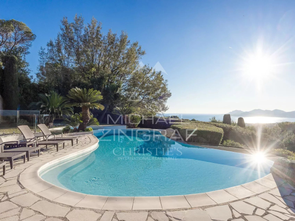 Idéalement située en position dominante, au cœur du très recherché secteur résidentiel du Cannet collines, cette exceptionnelle propriété surplombe la mer et l’Estérel, offrant une vue imprenable et un panorama d’une rare beauté. Exposée sud-ouest, elle bénéficie d’un ensoleillement optimal tout au long de la journée, sublimant chacun de ses espaces intérieurs et extérieurs. De style Couëlle, cette villa d’environ 500 m² s’épanouit sur un terrain entièrement complanté de 3 517 m², alliant intimité, quiétude et élégance naturelle. Son architecture s’intègre parfaitement à l’environnement, renforçant l’harmonie entre la villa et son cadre exceptionnel. Un élégant driveway mène à la villa, conférant à l’ensemble une noblesse certaine dès l’arrivée. La propriété offre un confort exceptionnel, avec de vastes espaces de réception de plain-pied ouvrant directement sur la piscine a forme libre et ses terrasses baignées de soleil. Elle dispose de six chambres en suite, dont un appartement indépendant idéal pour accueillir amis, famille ou personnel de maison dans les meilleures conditions. Il s’agit d’une opportunité rare d’acquérir une propriété de style Couëlle, une architecture que l’on retrouve peu, et encore plus rarement sur les collines de Cannes. Une villa rare et confidentielle, alliant prestige, espace, luminosité et vue mer spectaculaire : une adresse d’exception pour une clientèle exigeante et connaisseuse.