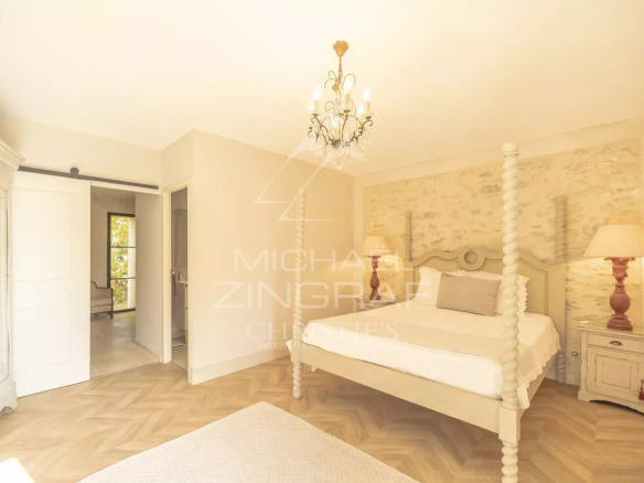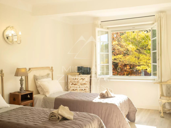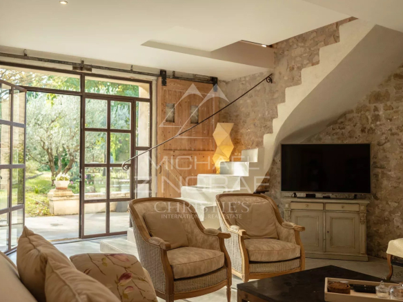 Édifiée sur un terrain arboré d’environ 6 300 m², la propriété développe plus de 480 m² habitables. Le rez-de-chaussée offre de vastes espaces de vie baignés de lumière, dont plusieurs salons, une salle à manger chaleureuse, une grande cuisine et des accès directs vers les terrasses et le jardin. L’ensemble a été rénové avec soin, dans le respect du style provençal.