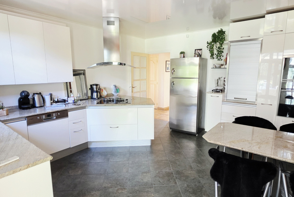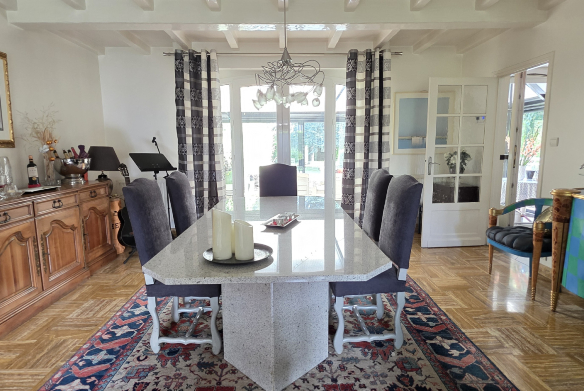 Salle à manger lumineuse ouverte sur cuisine aménagée et équipée avec matériaux nobles