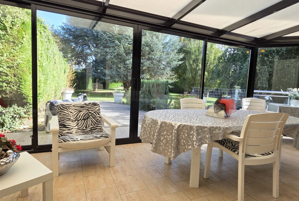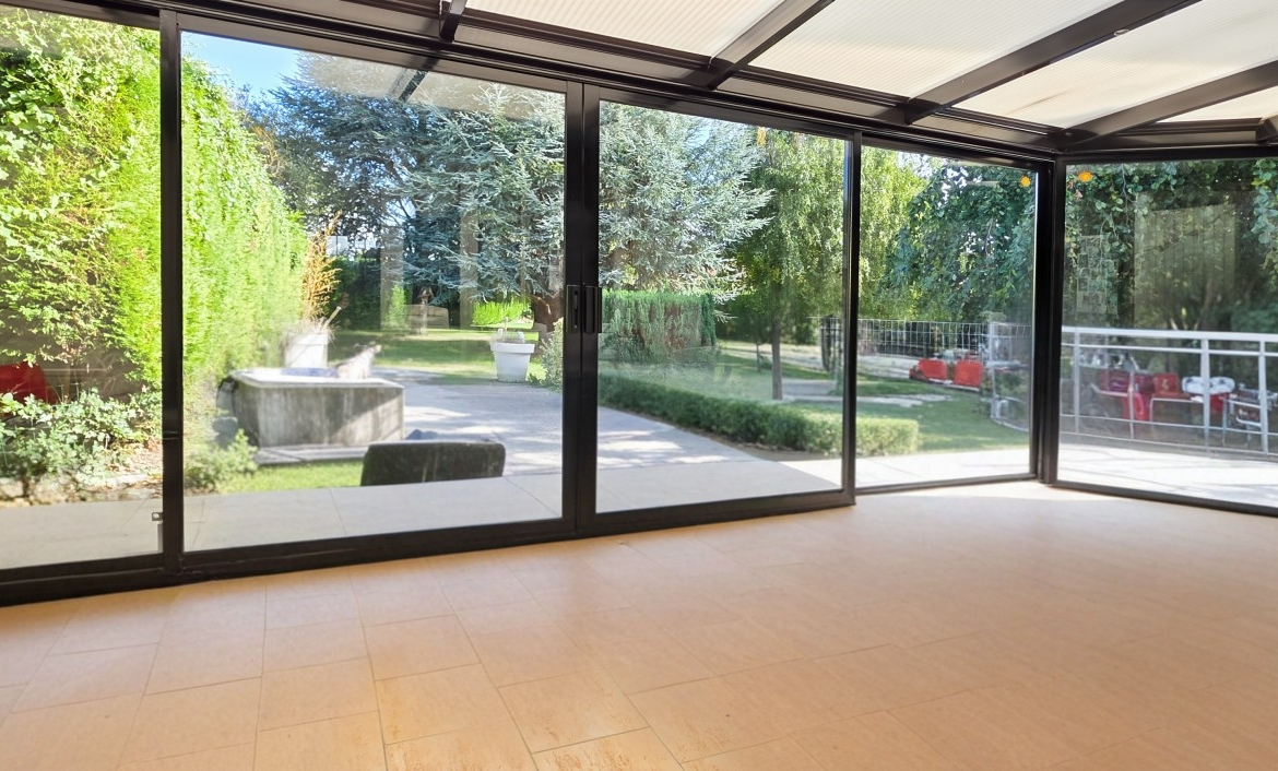 Accès à une véranda baignée de lumière avec vue sur le jardin