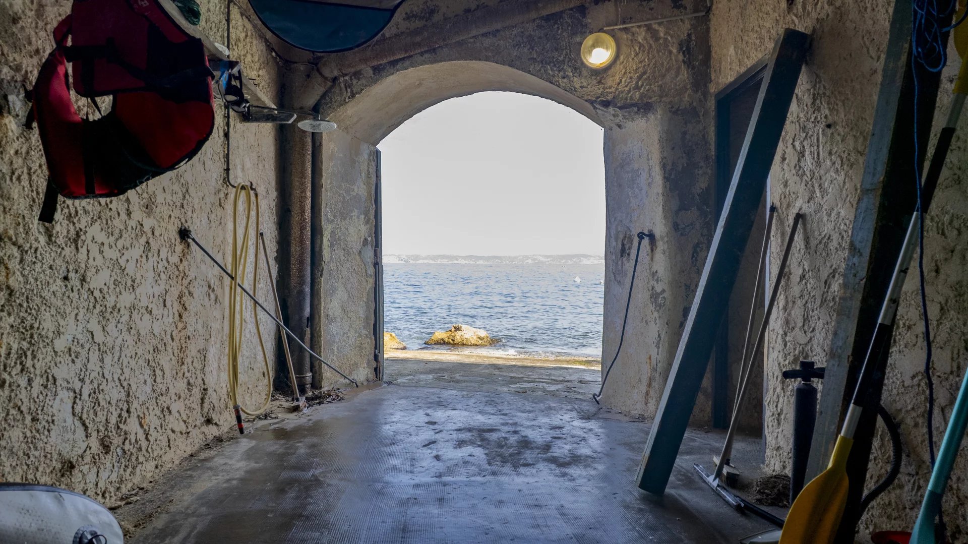 Un escalier dans la roche permet un accès privé à la mer. Un garage à bateau avec une mise à l’eau privative.