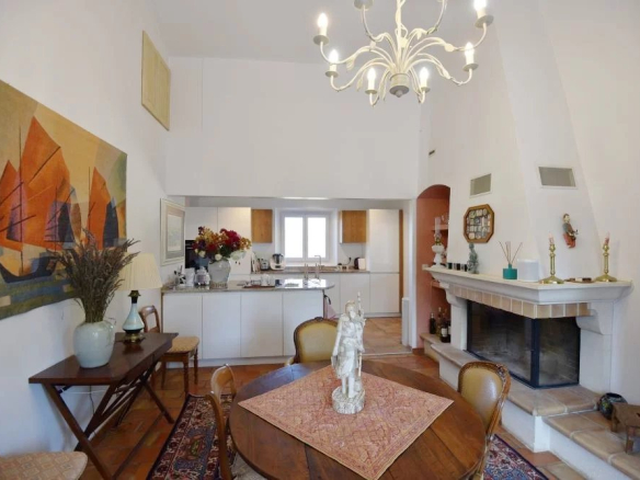 Une salle à manger avec cheminée ouverte sur une cuisine équipée
