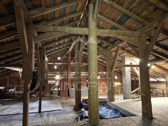 Etablie sur un terrain de plus de 2400 m2, la ferme se compose de deux niveaux, avec une partie d’habitation en rez-de-jardin de 192 m2 et en partie supérieure d’un vaste espace cathédrale avec sa charpente en bois, ainsi que d’une grange et d’un mazot, pour une surface totale de 500 m2 environ.