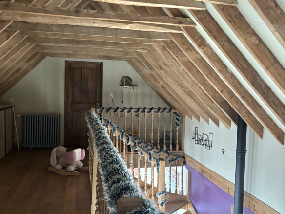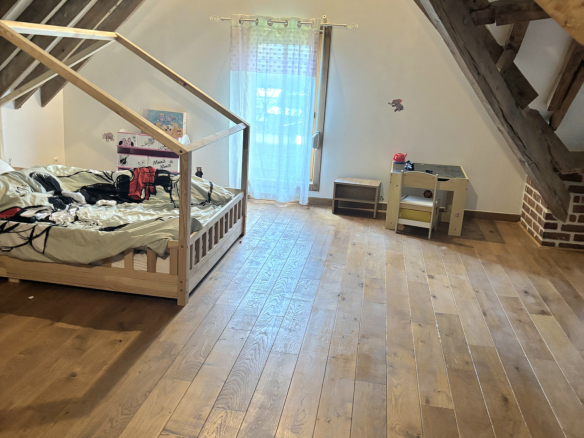 À l’étage, un spacieux palier de 19 m2 doté de nombreux rangements dessert trois magnifiques chambres de 32, 26 et 21 m2, toutes munies d’un parquet massif et de poutres apparentes.