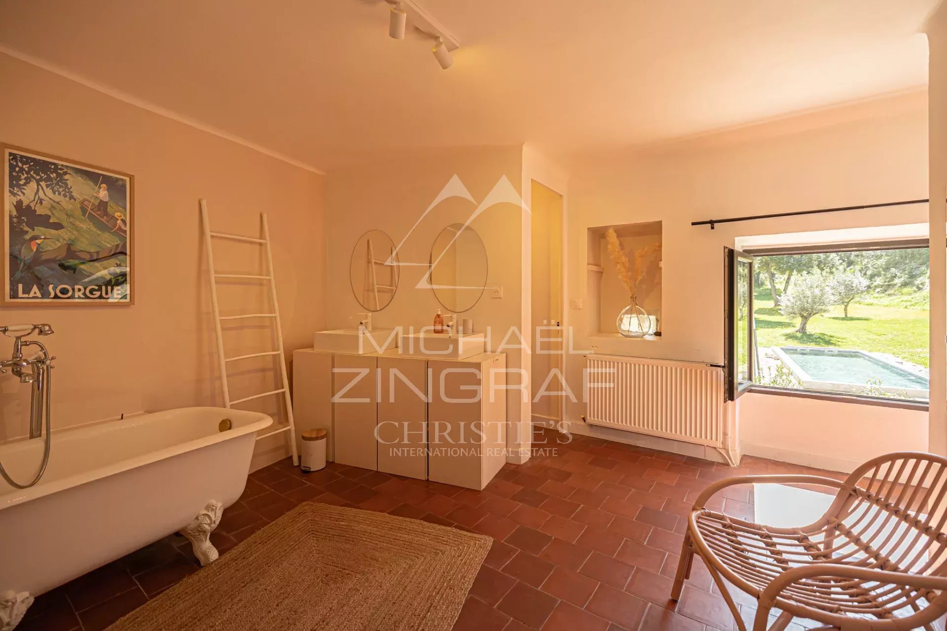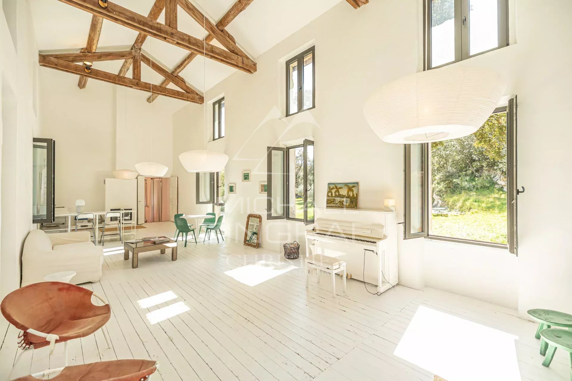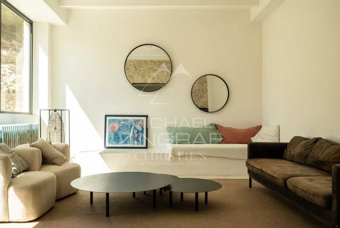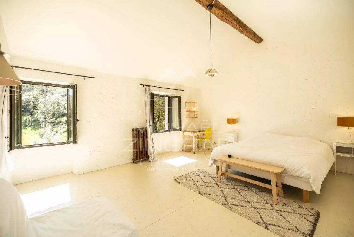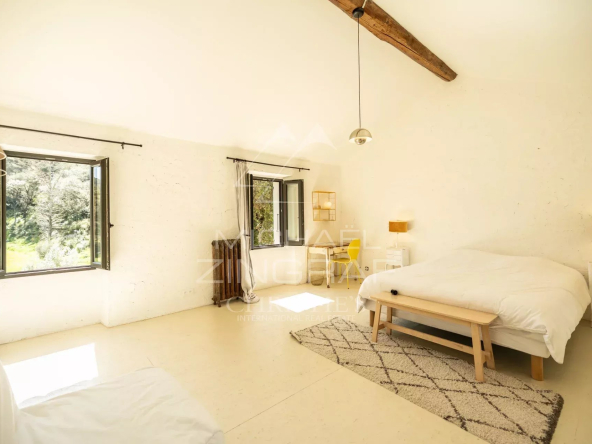 Au 1er et 2ème étage, quatre chambres supplémentaires bénéficient de belles superficies, la plupart disposant de leur propre salle d’eau. Un superbe second salon très lumineux de 60m2 avec plafond double hauteur, pièce maîtresse de ce niveau, offre une vue imprenable sur la piscine. L’ensemble de la rénovation a été réalisé dans un esprit sobre et qualitatif, mettant en valeur les matériaux anciens et l’authenticité des lieux tout en intégrant des prestations contemporaines.