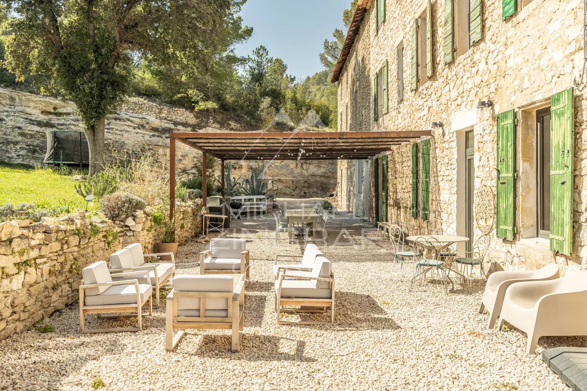 Le parc, entièrement aménagé, comprend plusieurs terrasses ombragées, des espaces de détente, une piscine au design épuré et un terrain de pétanque. Le cadre est calme, protégé et sans vis-à-vis, avec une vue dégagée sur la végétation et les reliefs environnants.