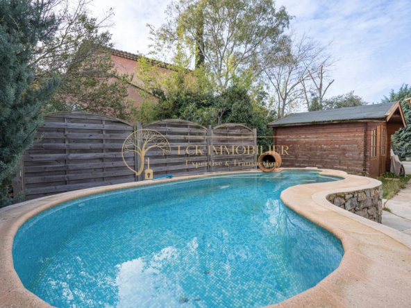 Située dans un quartier pavillonnaire calme et recherché de Fréjus, cette propriété d’environ 150 m² habitables offre un cadre de vie paisible et de belles possibilités d’aménagement. La maison principale se compose de 4 pièces aux volumes généreux, avec un séjour traversant ouvrant sur un jardin arboré sans vis-à-vis, agrémenté d’une piscine.