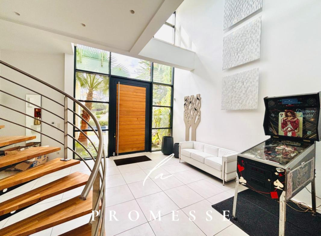 Le jardin paysagé est agrémenté d’une PISCINE CHAUFFÉE par pompe à chaleur . Les équipements incluent un espace modulable (actuellement un simulateur de GOLF), un garage pour deux à trois véhicules et un ASCENSEUR desservant tous les niveaux.