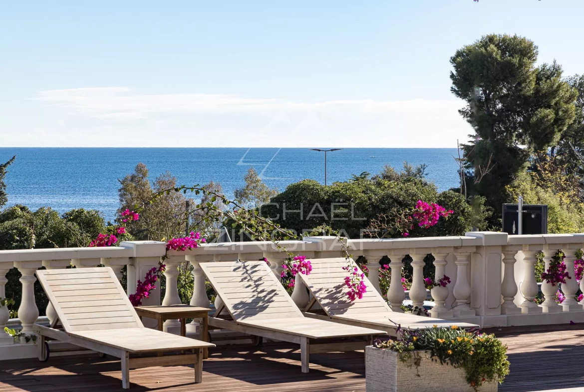 Aux portes de Super Cannes, cette villa de plus de 200 m² offre une vue mer panoramique dans un jardin paysager et fleuri de 1 237 m² aux essences exotiques.
