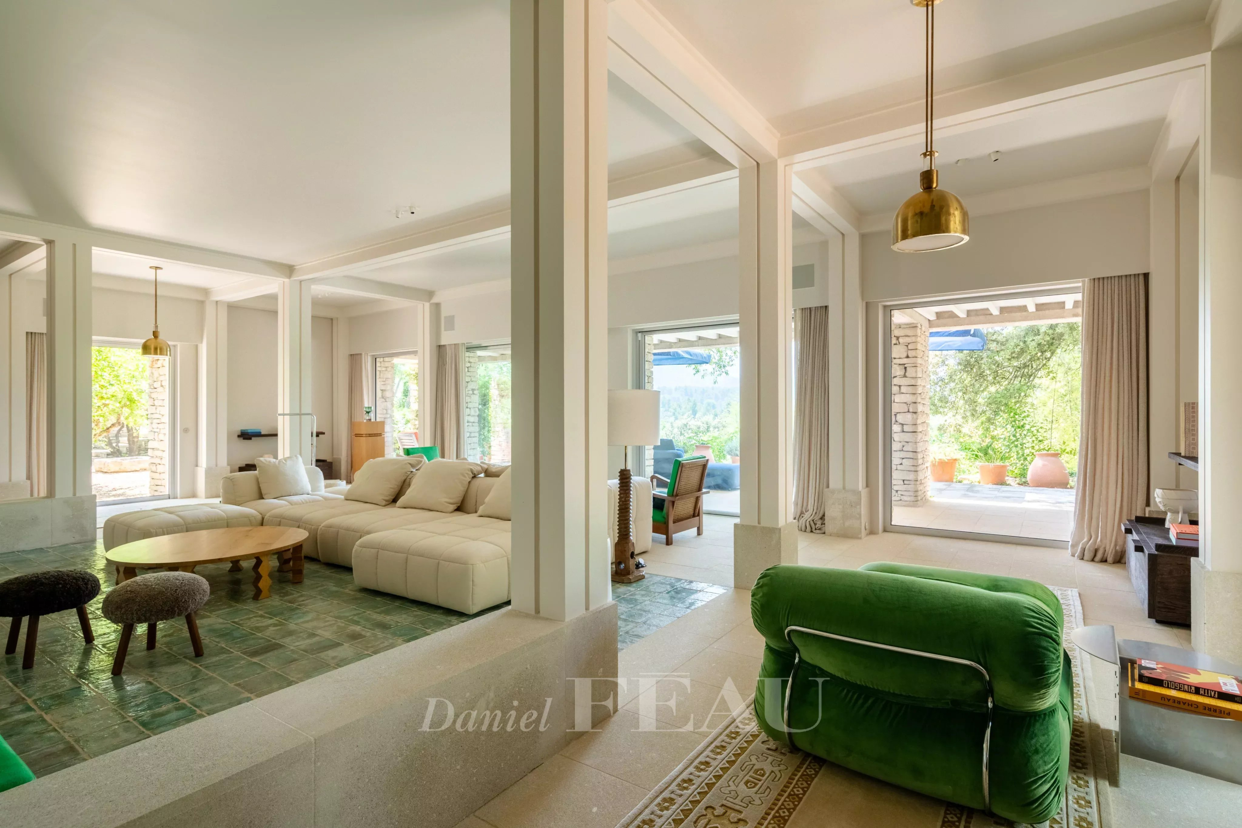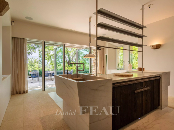 À l’intérieur, un élégant escalier hélicoïdal relie harmonieusement la bastide et la maison d’amis, tout en permettant à chaque espace de conserver son indépendance. Les volumes généreux sont sublimés par de larges baies vitrées pour une luminosité optimale en toute saison..